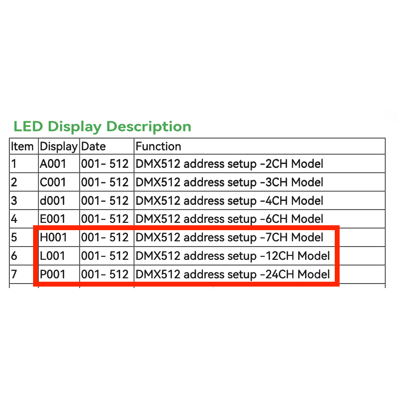 - Se entregan 3 Fixtures, para los modos de 7CH (H001), 12CH (L001) y 24CH (P001).