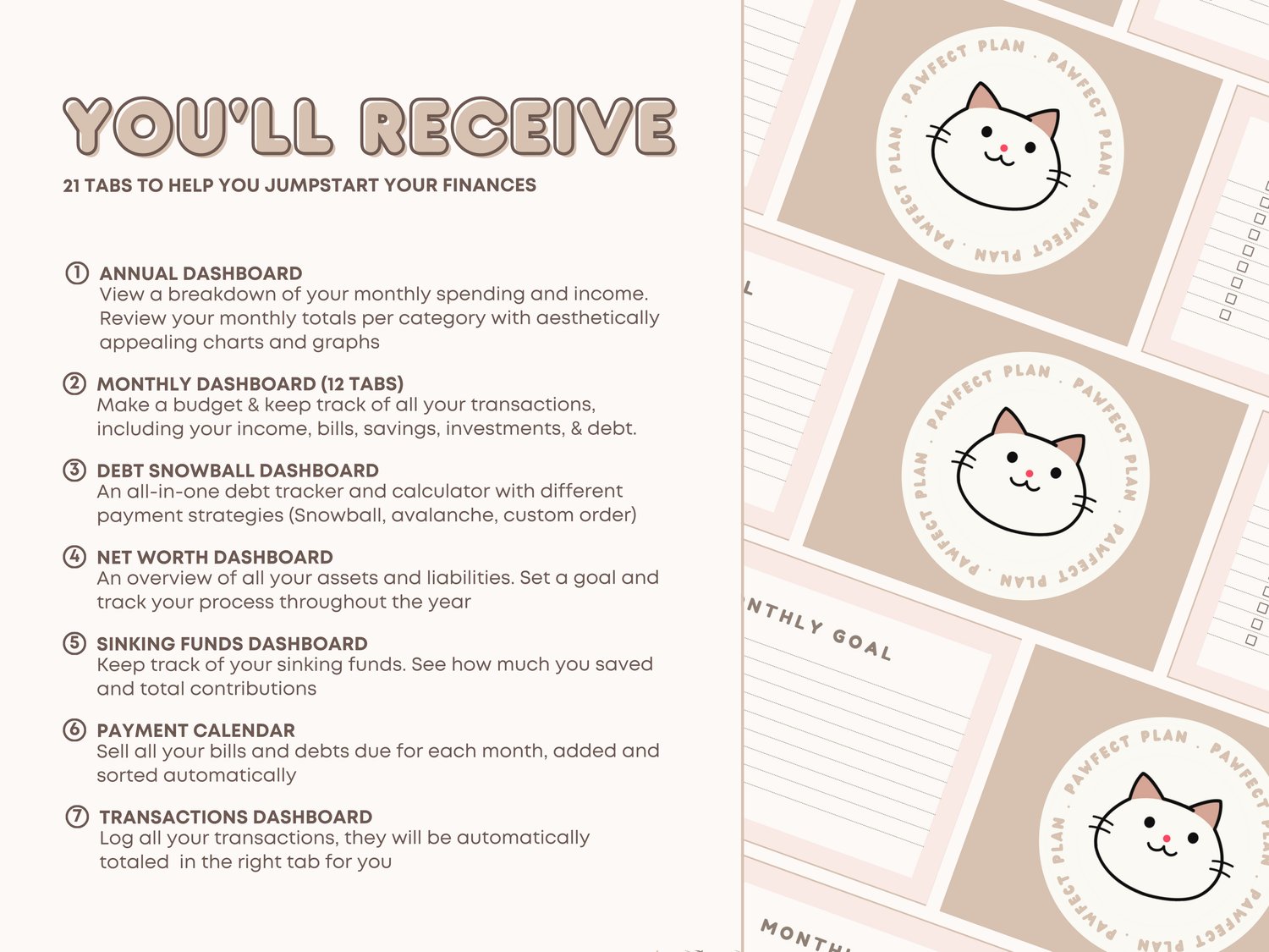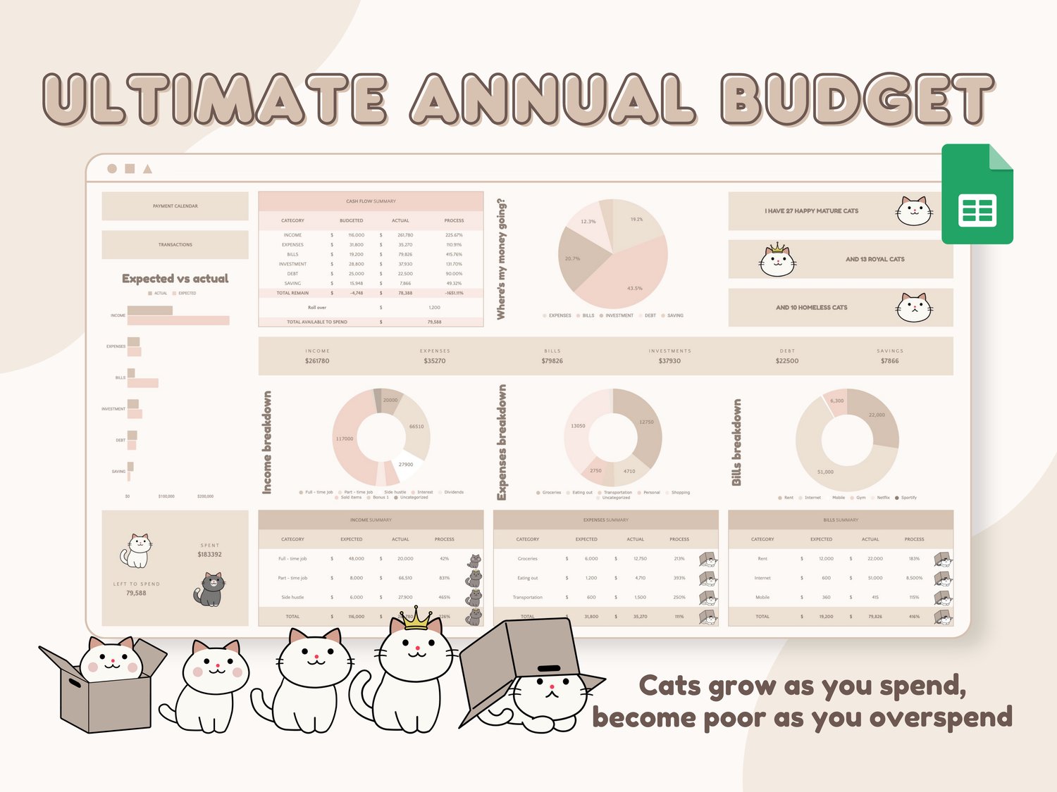 This Annual Budget Spreadsheet uses a Raising Pets concept to inspire users and provides a visual representation of how your expenses, bills, savings, and debt payments look based on your budget. It is designed to be super cute, fun, and simple to use.