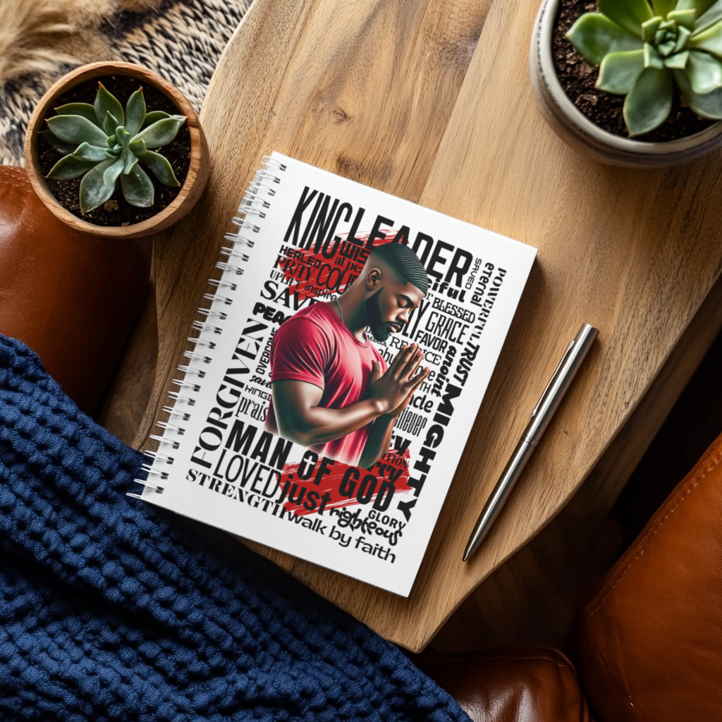 Celebrate faith, strength, and leadership with this powerful and visually striking digital journal cover. Featuring a powerful image of a young Black man in prayer, centered in strength, peace, and purpose. Surrounded by affirmations like KING, LEADER, MAN OF GOD, FORGIVEN, and WALK BY FAITH, this artwork speaks to the spiritual warrior within, this design is a celebration of spiritual strength, identity, and purpose.