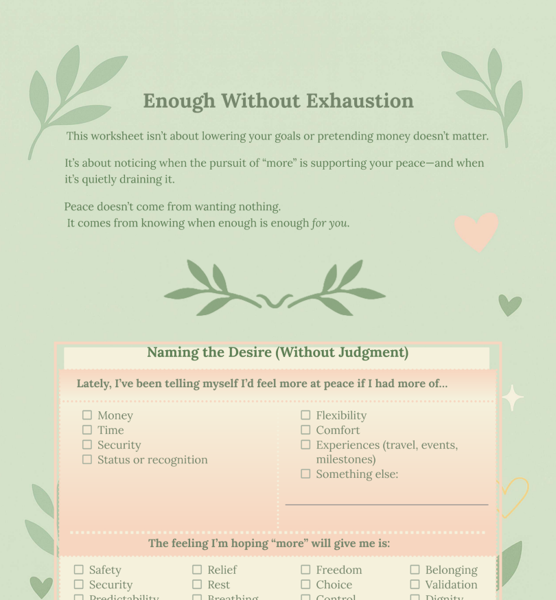 Enough Without Exhaustion is a guided reflection designed to help you explore ambition, desire, and worth without judgment or pressure. Rather than asking you to give things up, it invites you to pause and ask why you’re chasing them—and what your nervous system actually needs right now.