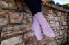 • Spring Leaf Socks are toe-up socks worked in stockinette stitch on the sole and back of the leg. This allows for extra stitches to be added if a wider leg is required (see note below). A lace leaf design starts at the top of the foot and continues up the front of the leg.