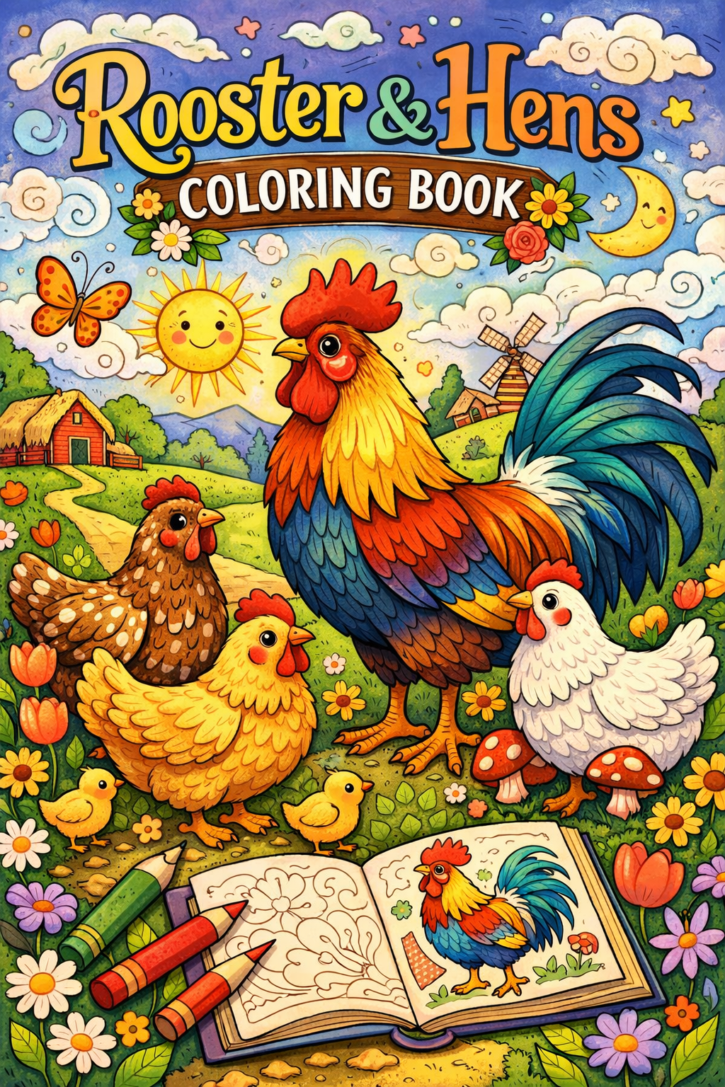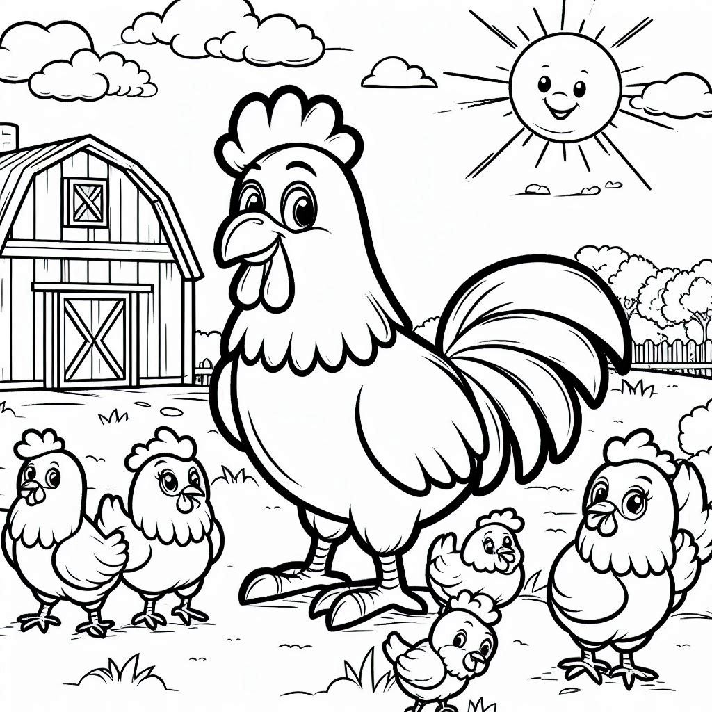 Rooster and hens, coloring ebook, 60 designs, digital printable product, instantly download