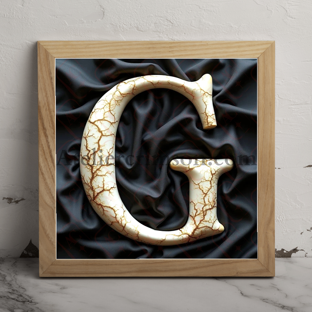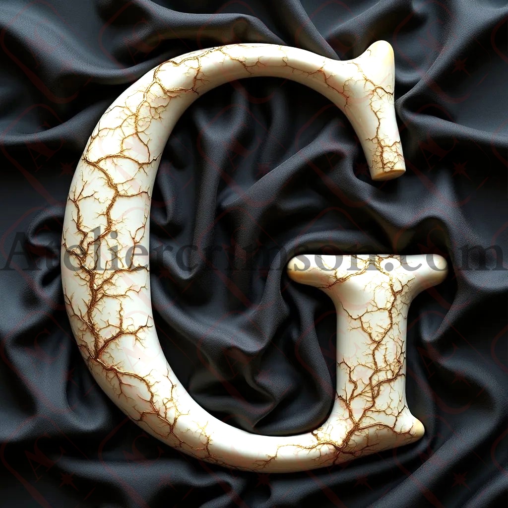 The letter G Bones with gold fissures A hauntingly beautiful character crafted from pristine human femur bones, intricately arranged to form a bold, serif typeface. Delicate golden fissures, reminiscent of kintsugi art, weave through the ivory-white osseous structure, adding an element of elegant repair. The character stands proudly on a luxurious marbled floor, its form casting subtle shadows. Behind it, a textured black linen backdrop provides a striking contrast, emphasizing the letter's ethereal beauty.