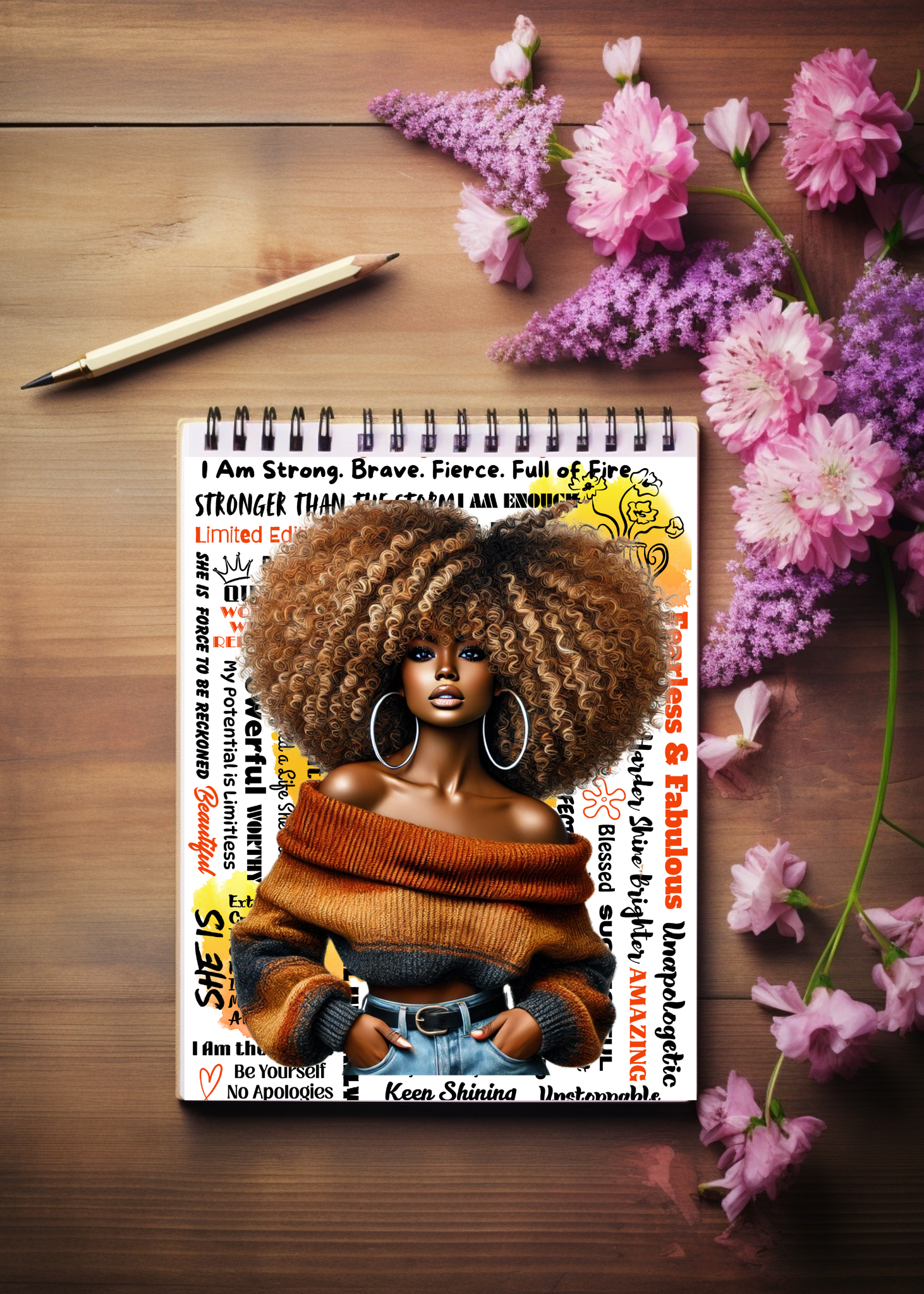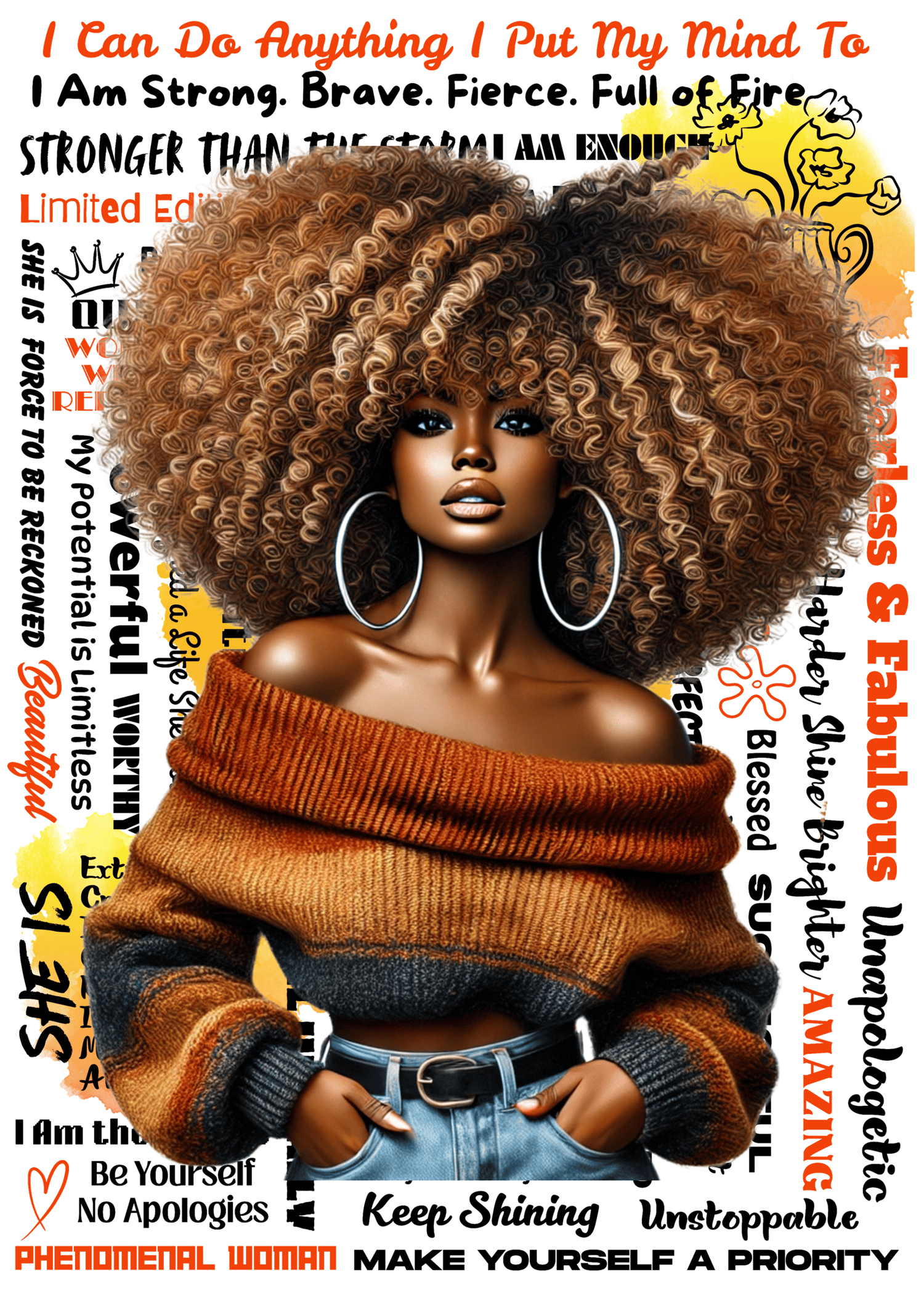 This high-resolution digital planner cover features a stunning illustration of a confident Afro-textured beauty wrapped in warm tones, surrounded by empowering affirmations like “Fearless & Fabulous,” “Phenomenal Woman,” and “Keep Shining.”