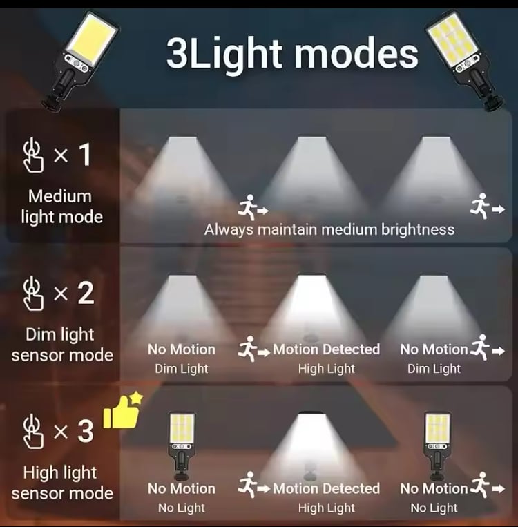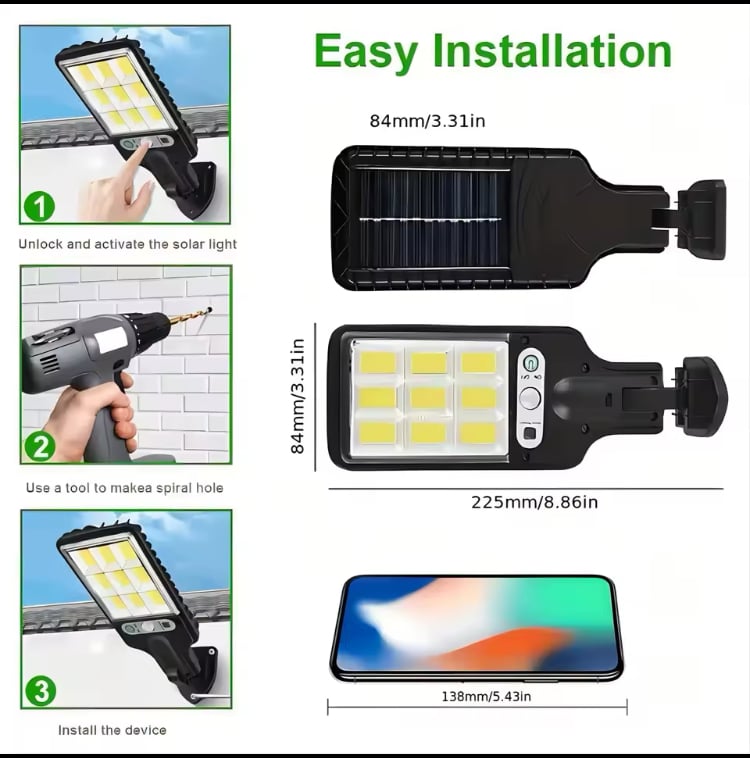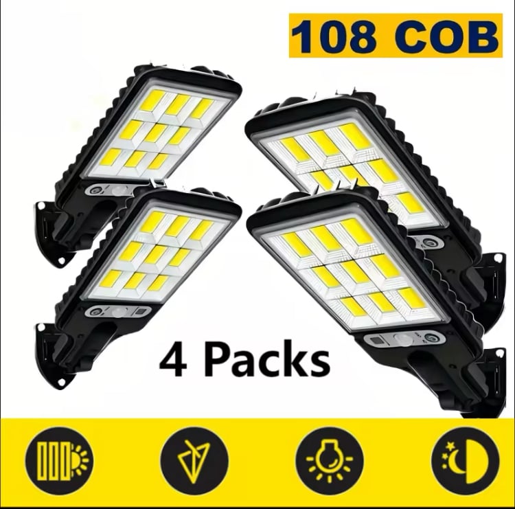 Brighten up your outdoor spaces with these durable solar street lights. Each pack comes with 2 or 4 fixtures featuring 108 high‑efficiency COB LEDs, an adjustable motion sensor, and three lighting modes you control via included remote. Weather‑resistant and easy to install—no wiring required—these lights charge by day and automatically illuminate at night, making them perfect for pathways, gardens, driveways, and security lighting.