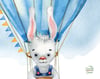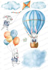Air adventure. Party decoration elements: cute funny bunnies, hot air balloon, kite, bunch of balloons, clouds, flags. Kids birthday and baby shower theme