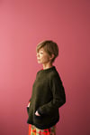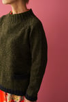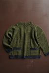 Sweater knitted in the round from the top down. After collar is knitted, the neckline is shaped with German short rows then the upper body is worked until separate from sleeves. Once body is complete, textured raglan lines are grafted together in order to form sleeve gussets. The sleeves can be knitted using the magic loop method, or using DPNs. At the end, pockets linings and hems are knitted and sewn to the body.