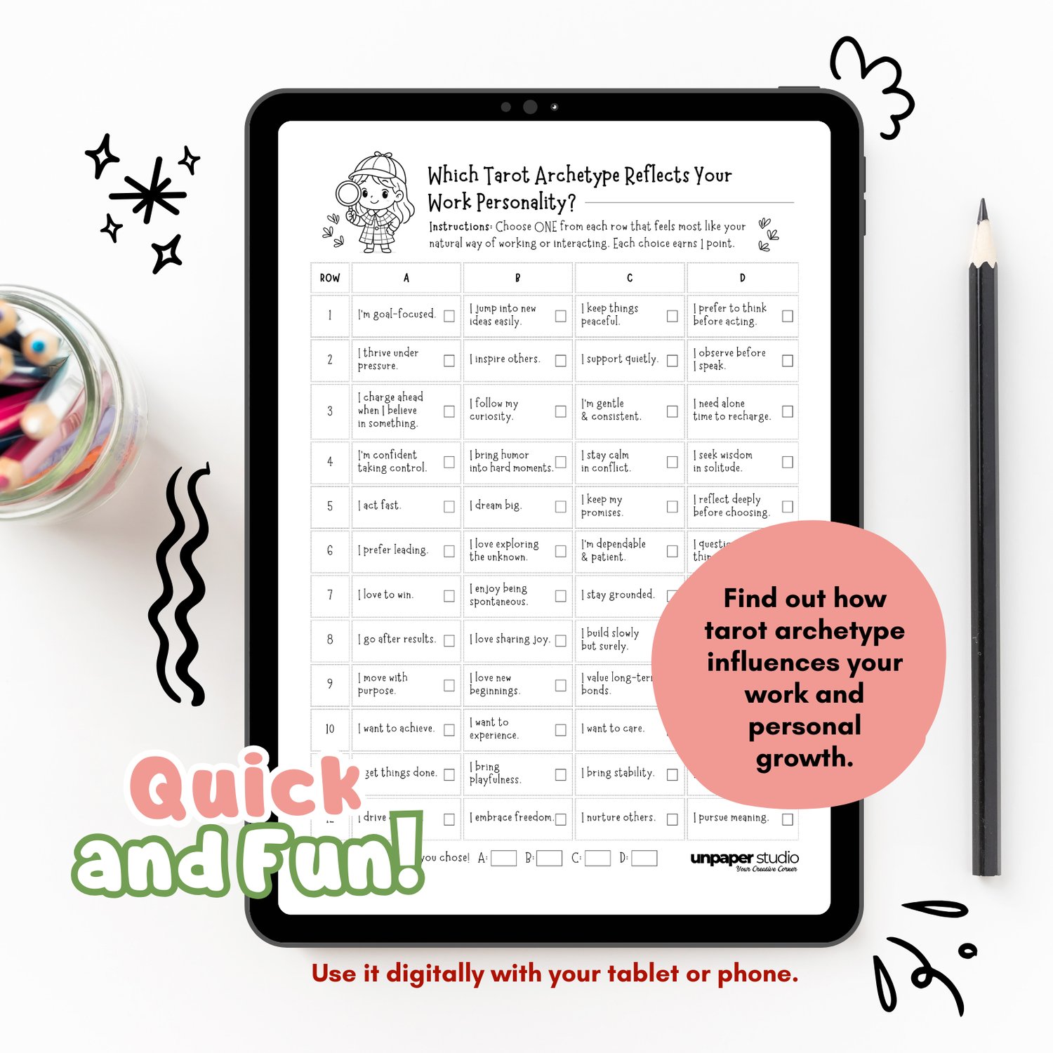 This unique printable DISC + Tarot Archetype Quiz blends the structure of DISC personality theory with the symbolism of the Major Arcana. Discover whether you’re a Warrior, Visionary, Nurturer, or Sage—and how your archetype influences your work, relationships, and emotional growth.
