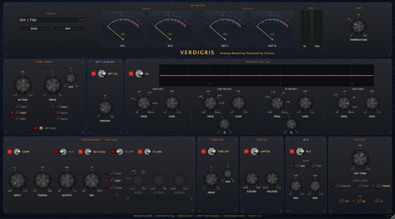 Verdigris is a mastering-grade signal processor built using the Patina DSP library. It integrates a complete signal chain modeled after high-voltage (100V–300V) tube circuitry, providing precise control over frequency balance, dynamics, and harmonic structure.