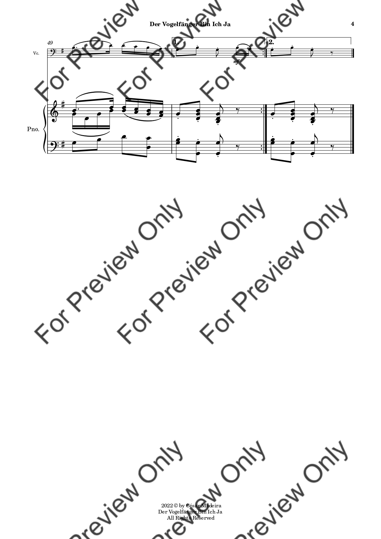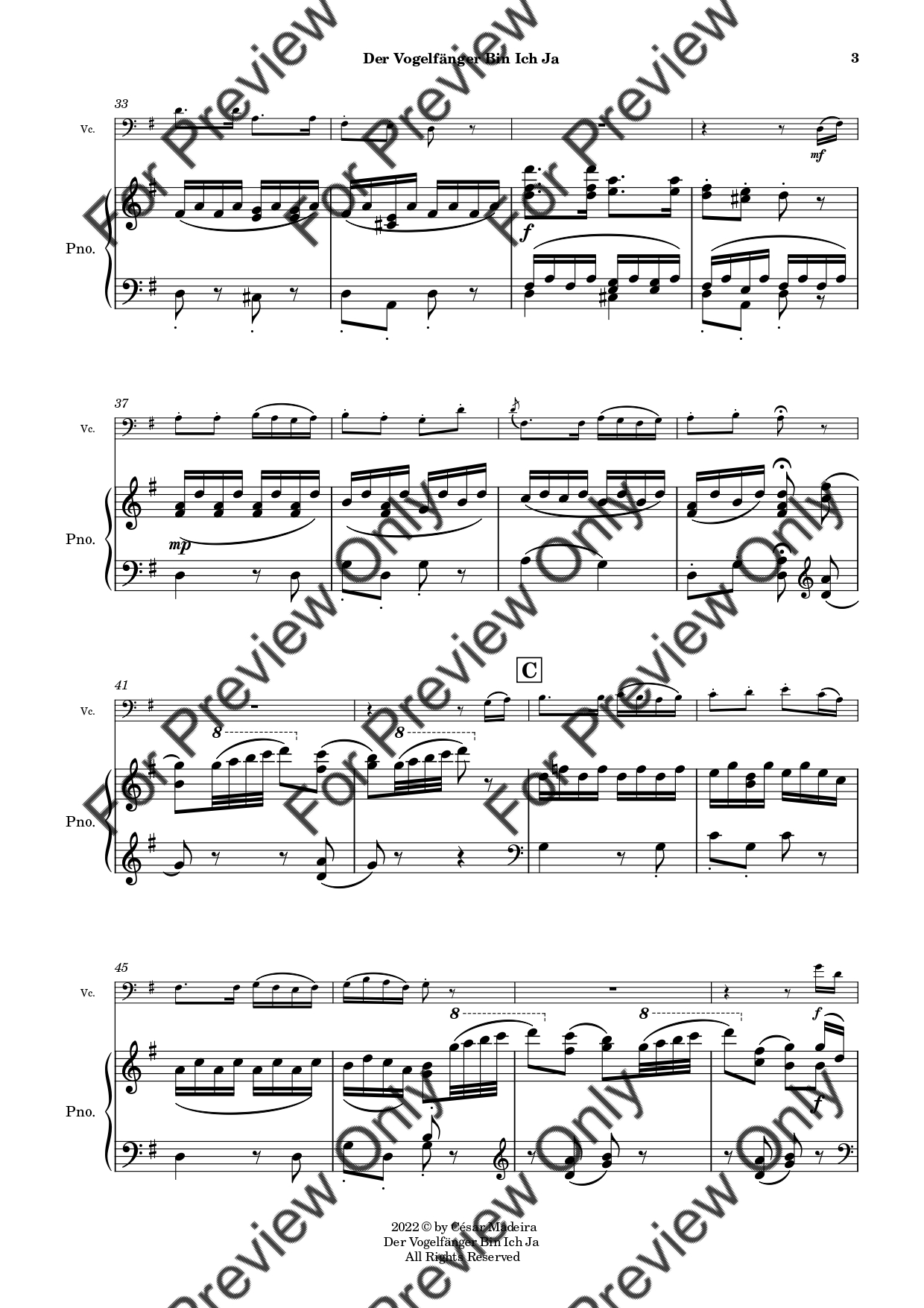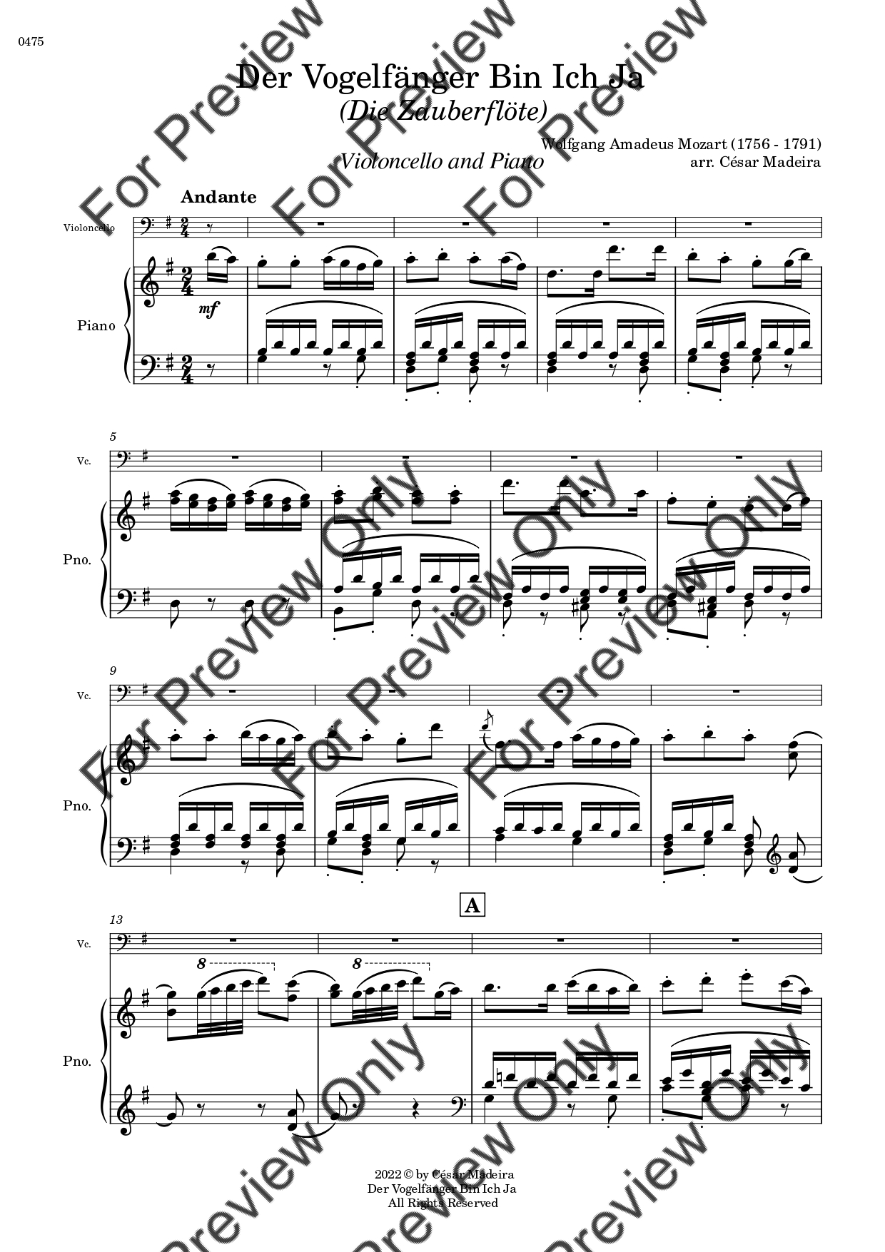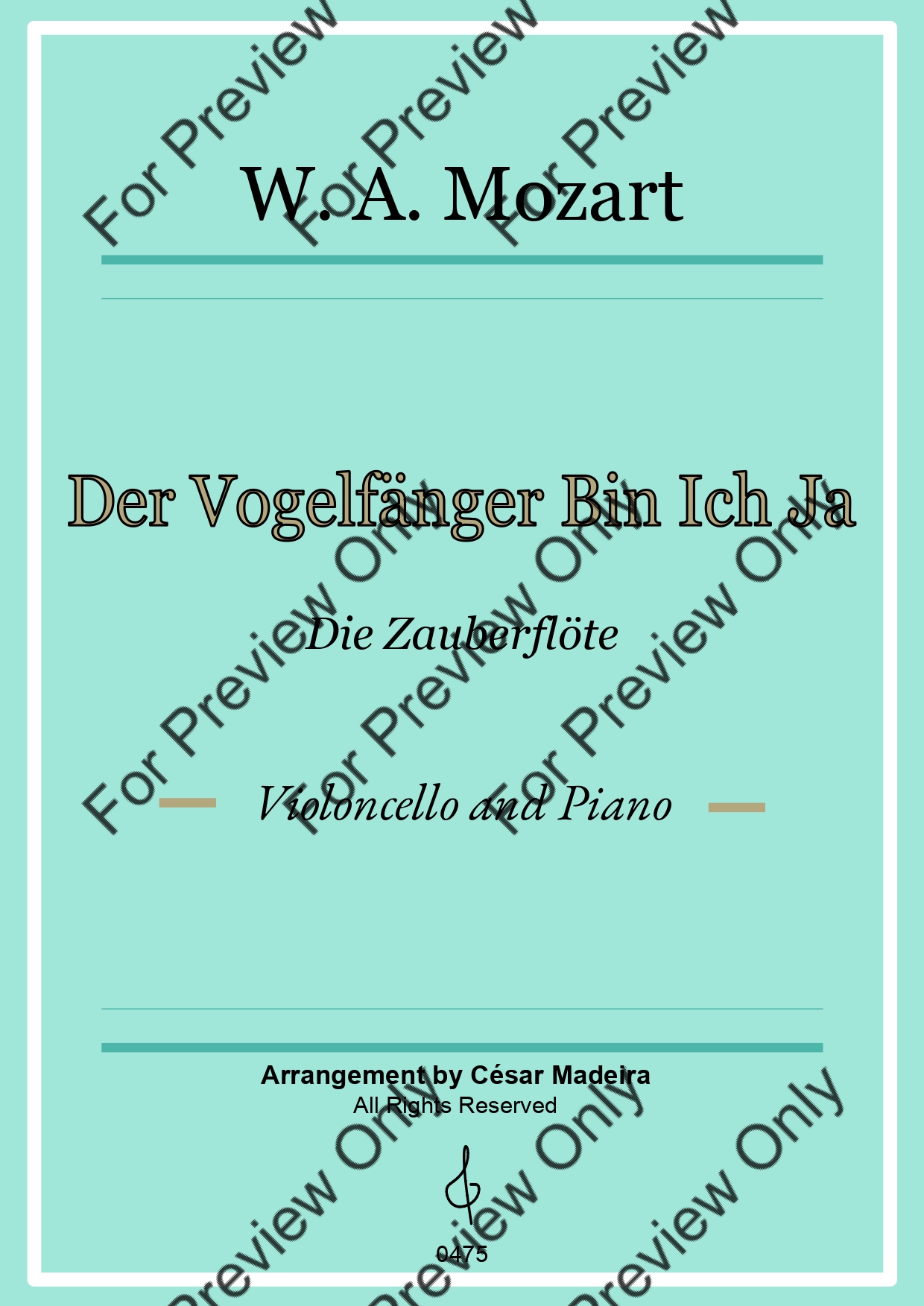 Der Vogelfänger Bin Ich Ja from Die Zauberflote (The Magic Flute) by Wolfgang Amadeus Mozart. Arrangement for Violoncello and Piano. With Full Score and Individual Parts. Have fun!