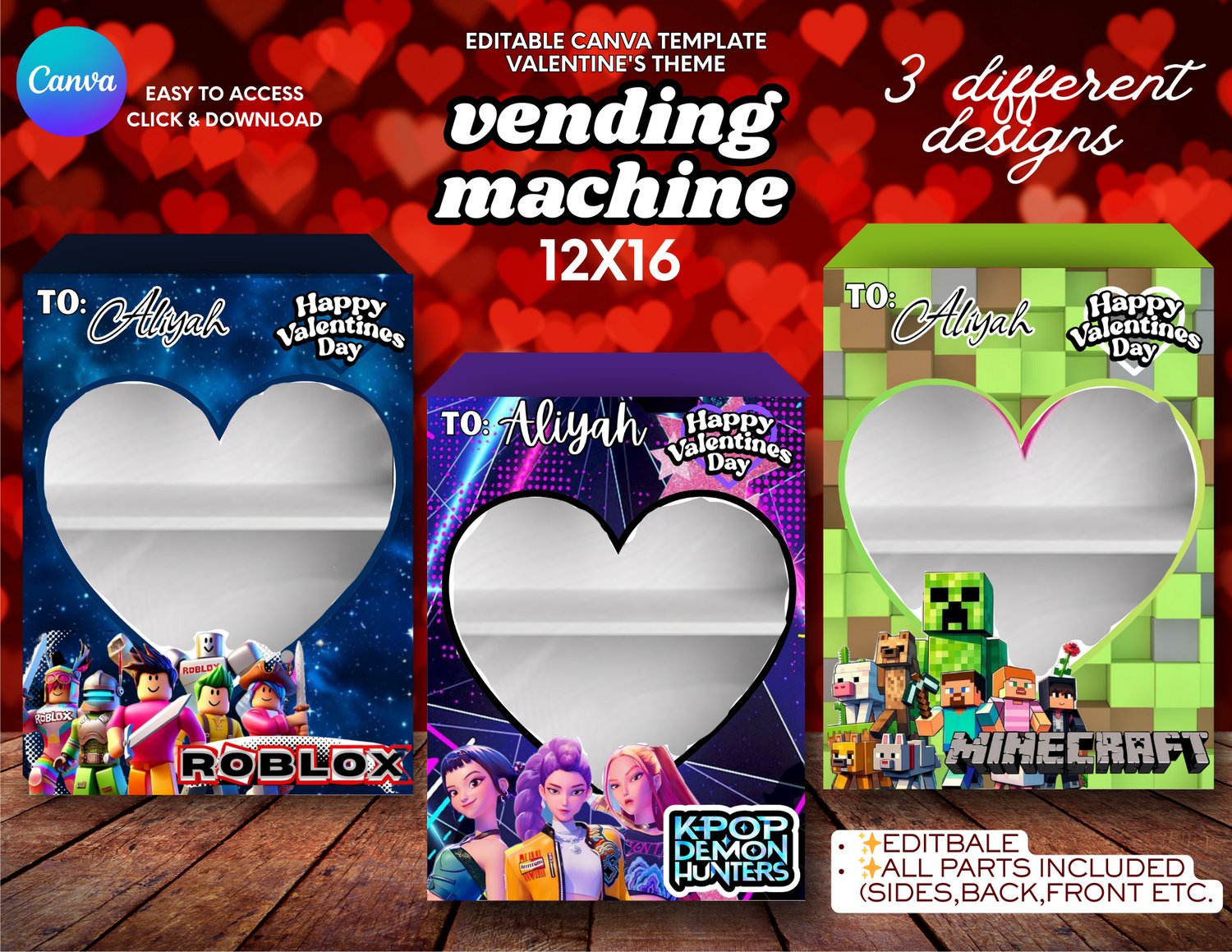 • 3 Valentine’s Vending Machine Templates (K-Pop Hunters, Minecraft, Roblox)
