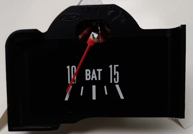 The M6566V is a shunt style OEM Amp meter from a 65 GT or 66 Mustang converted to read volts. It uses the original amp scale, but has been modified to indicate charge/discharge by voltage. If you want a face that shows volts, select the M6566VO listed below.