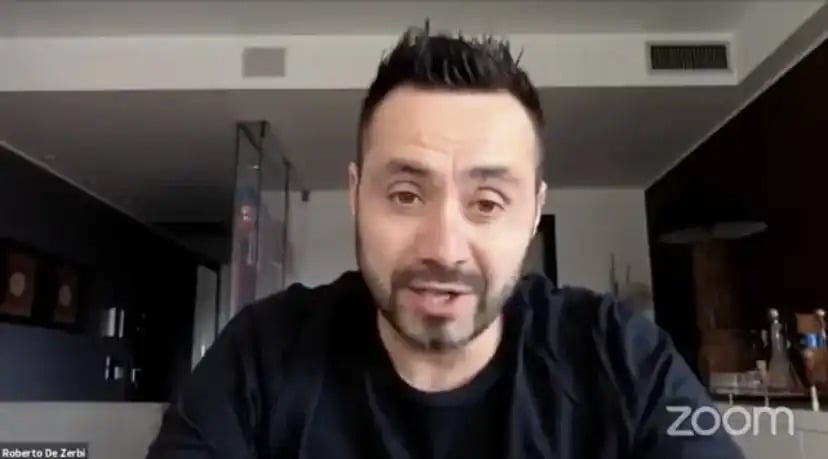 Roberto De Zerbi, current manager of Brighton & Hove Albion FC in the English Premier League. A webinar of the year 2020, in his coaching stage of the Sassuolo, with Renzo Uliviano for the Coverciano academy of the Associazione Italiana Allenatori Calcio.