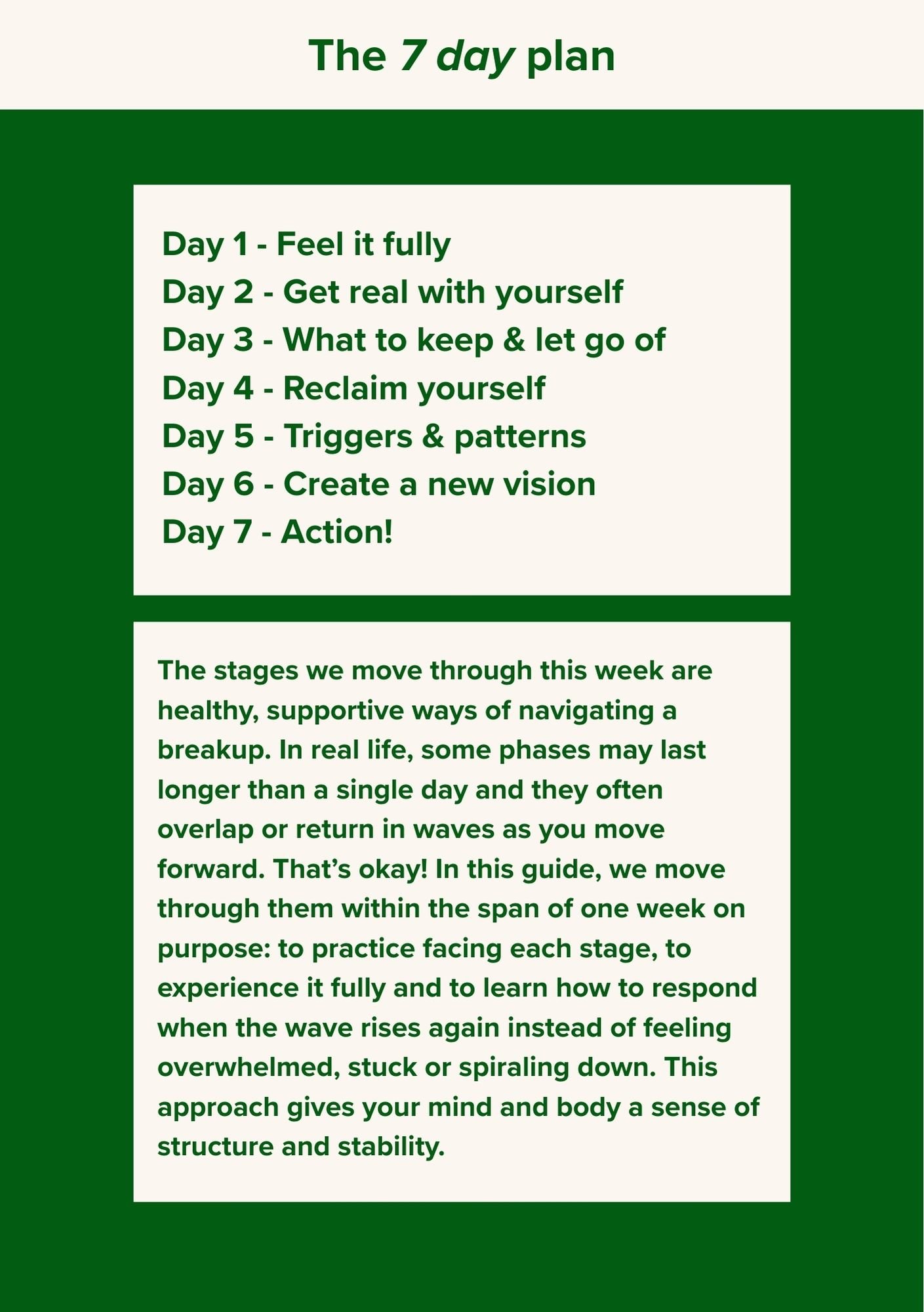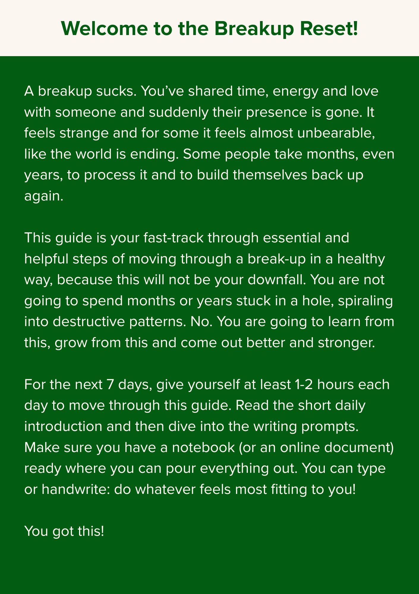 You’re not going to let this breakup be your downfall - you’re going to use it as an opportunity to grow and strengthen your foundation! This 7-Day Writing Guide with valuable insights and helpful writing prompts, will walk you through the essential stages of healing after heartbreak. In real life these stages may take longer or overlap, but here you practice meeting each one with clarity already. That way, when the waves return, you’ll know how to face them in a healthy way instead of falling into destructive patterns. Get the guide, grab your pen and paper and choose to do better. This is your reset - a chance to rebuild and rise!
