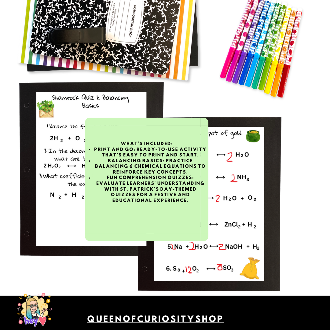Get into the St. Patrick's Day spirit while mastering the art of balancing chemical equations! The Leprechaun's Equation Challenge - St. Patrick's Day Edition is a festive and educational resource designed for high school chemistry students. Dive into the world of chemical reactions with a touch of Irish luck!