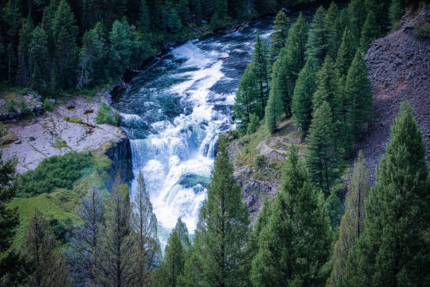 Set lower in the canyon, this view of Lower Mesa Falls feels more enclosed and intimate, with forest and rock guiding the eye toward the rushing water. It’s a place where the sound arrives before the view.