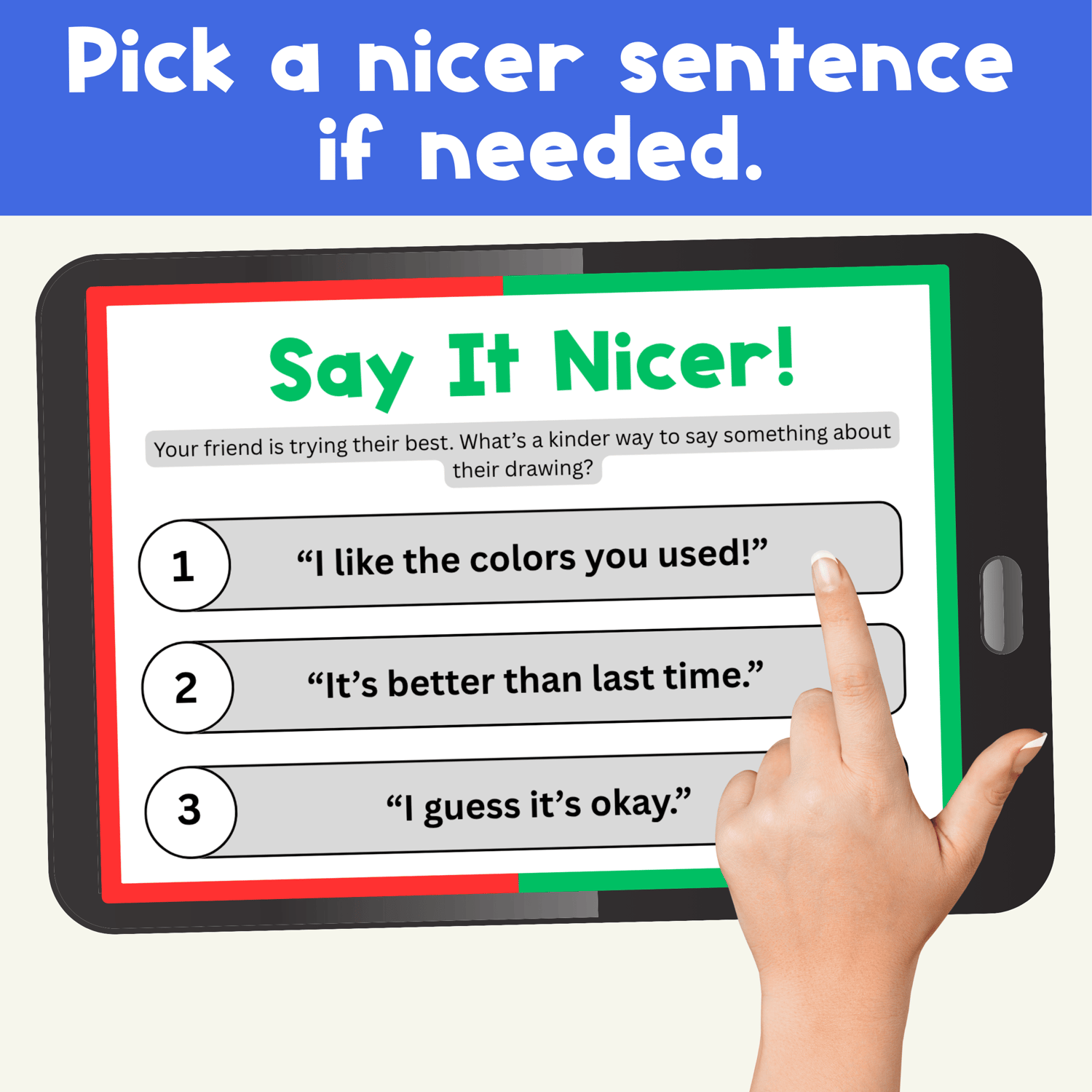 These interactive digital task cards help students learn how to respond kindly in real-life situations.
