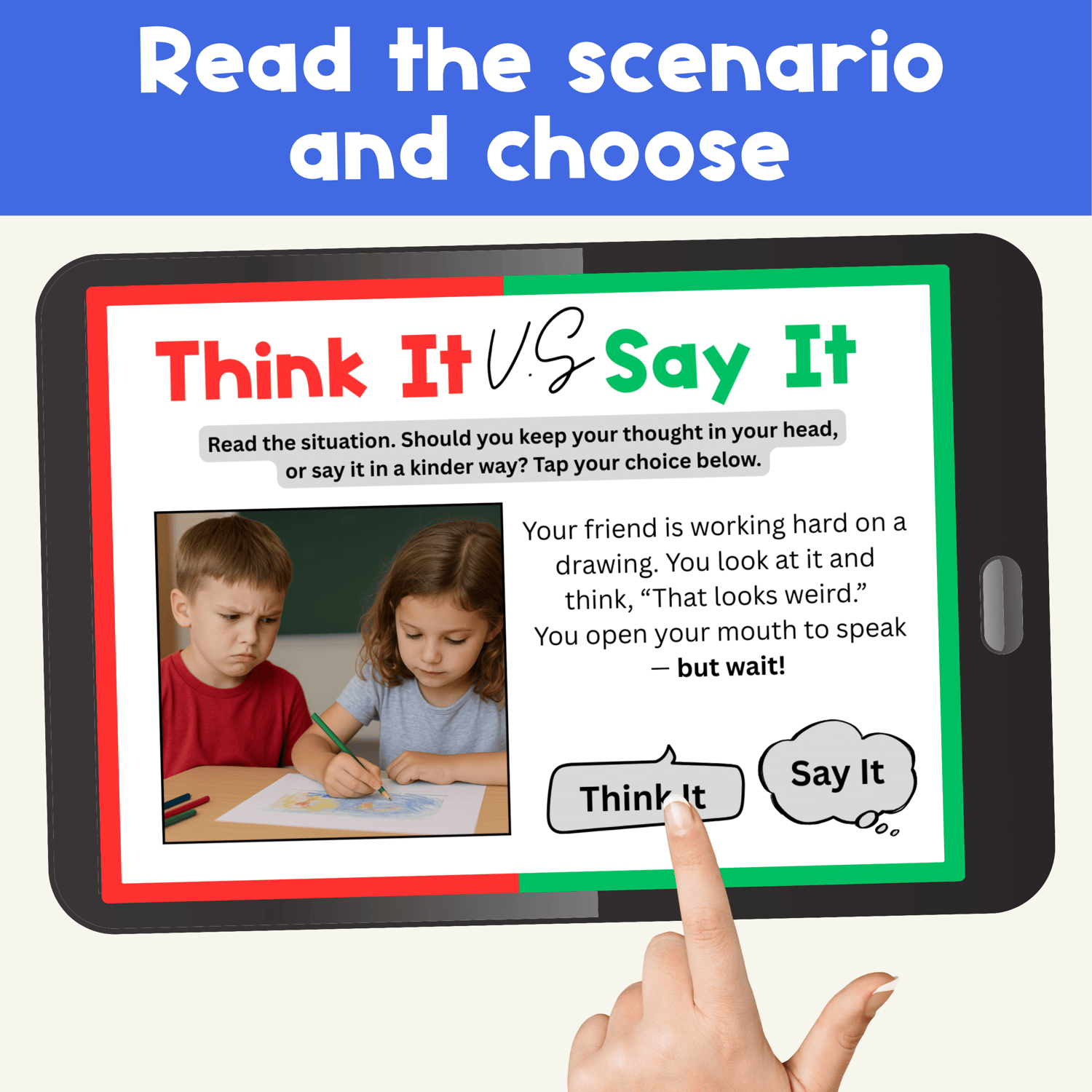 Students will read short scenarios and decide whether to keep a thought to themselves or say something in a nicer way. Great for social-emotional learning, speech therapy, or morning meetings!