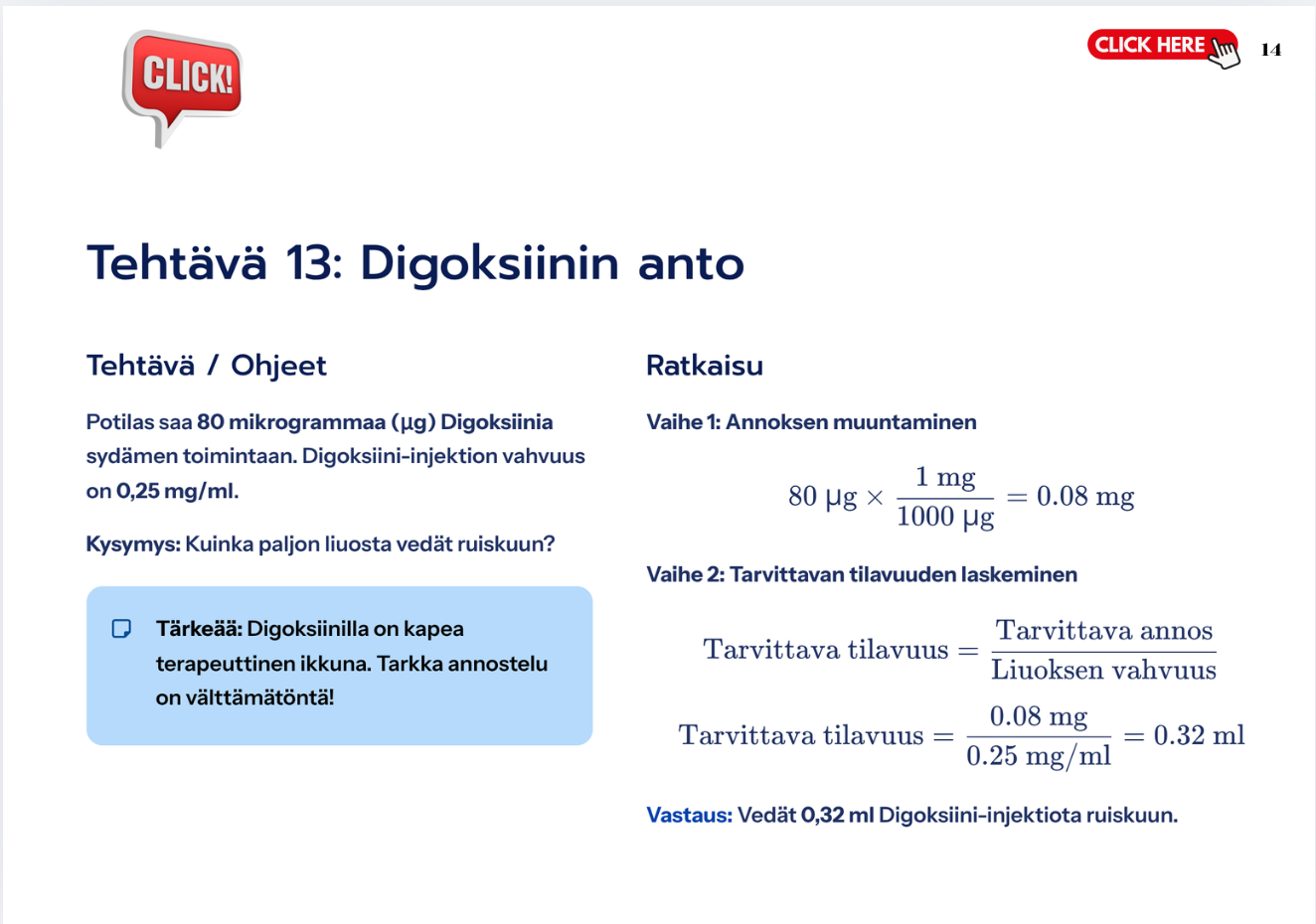 Materiaali auttaa ymmärtämään lääkelaskennan periaatteet sekä vahvistaa luottamusta lääkehoidon toteutuksessa. Sopii opiskelijoille ja työssä oleville hoitajille, jotka haluavat kerrata ja harjoitella omaan tahtiin.
