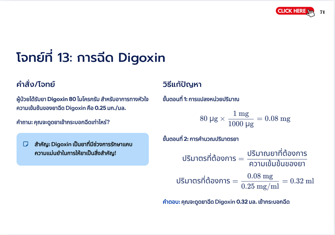 สื่อชุดนี้ช่วยให้เข้าใจหลักการคำนวณยาได้อย่างมั่นใจ และเพิ่มทักษะในการปฏิบัติงานด้านการให้ยาอย่างปลอดภัย เหมาะสำหรับนักเรียนพยาบาลและผู้ช่วยพยาบาลที่ต้องการทบทวนและฝึกฝนด้วยตนเอง.