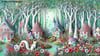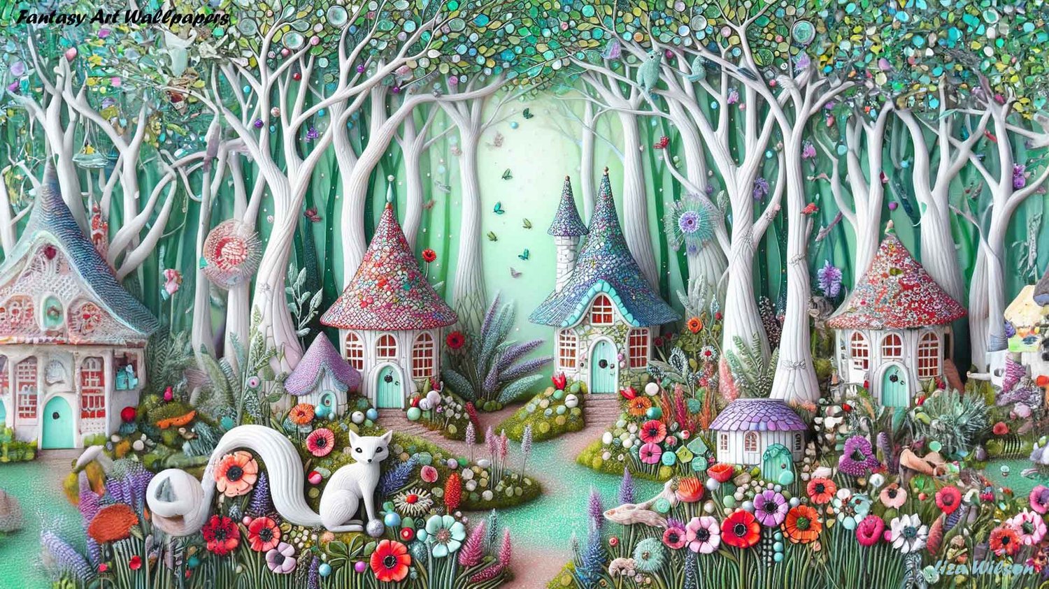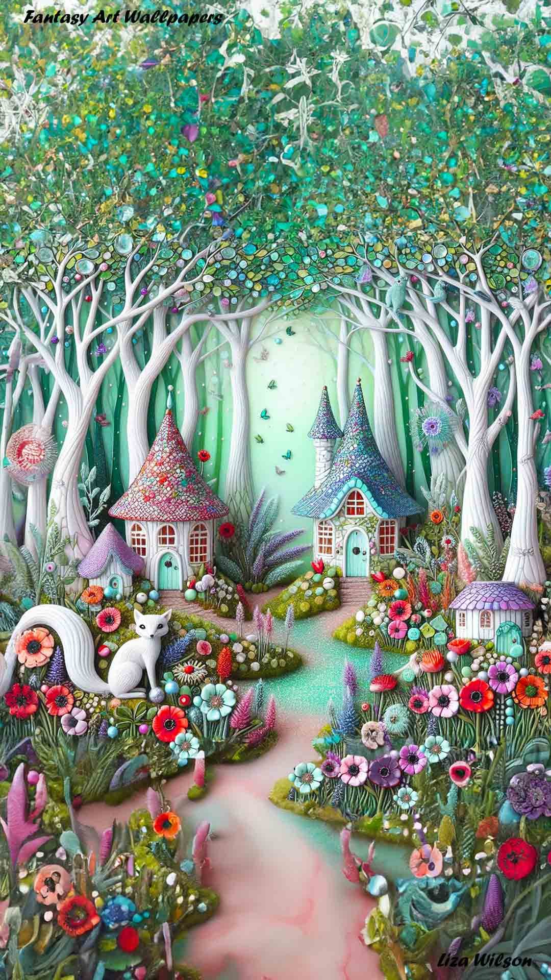 Whimsical fairy houses in a misty green forest with tall white twisty trees. There are poppies & sunflowers & a tiny whimsical white fox beside a sparkling lake. There are beautiful birds.