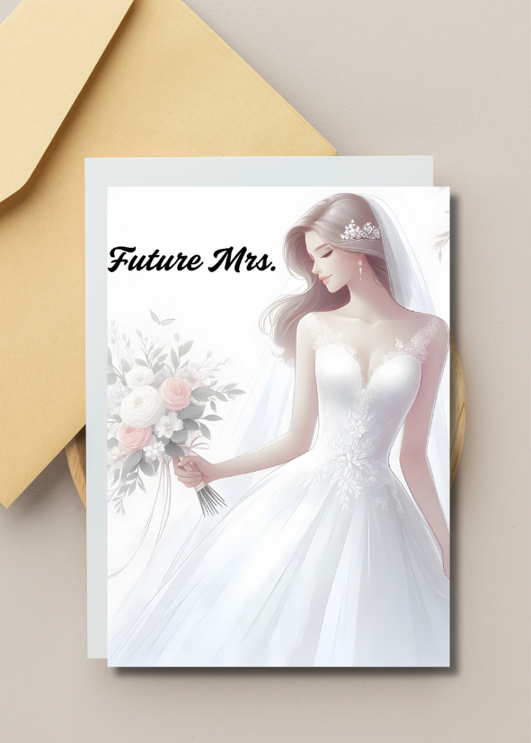 Celebrate the exciting journey to 'I Do' with our beautiful 'Future Mrs.' printable card! This elegant digital greeting card features a stunning bridal illustration, perfectly complemented by the classic 'Future Mrs.' text, making it an ideal choice for any bride-to-be.