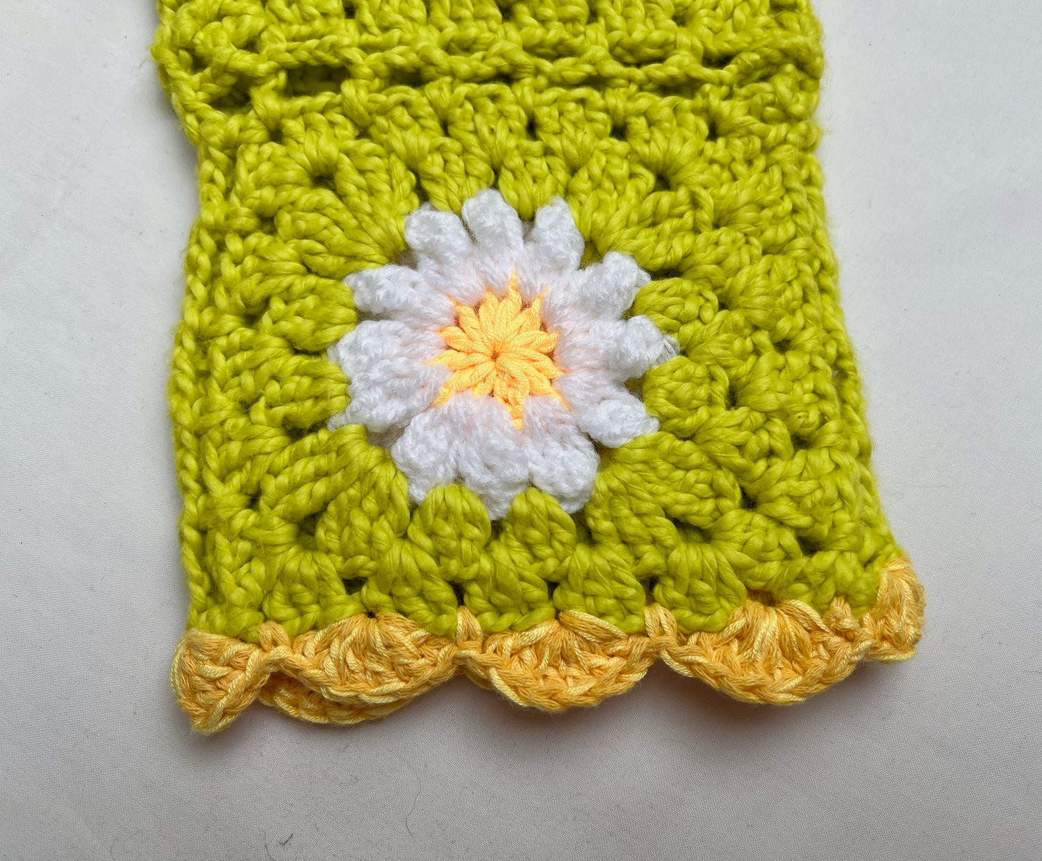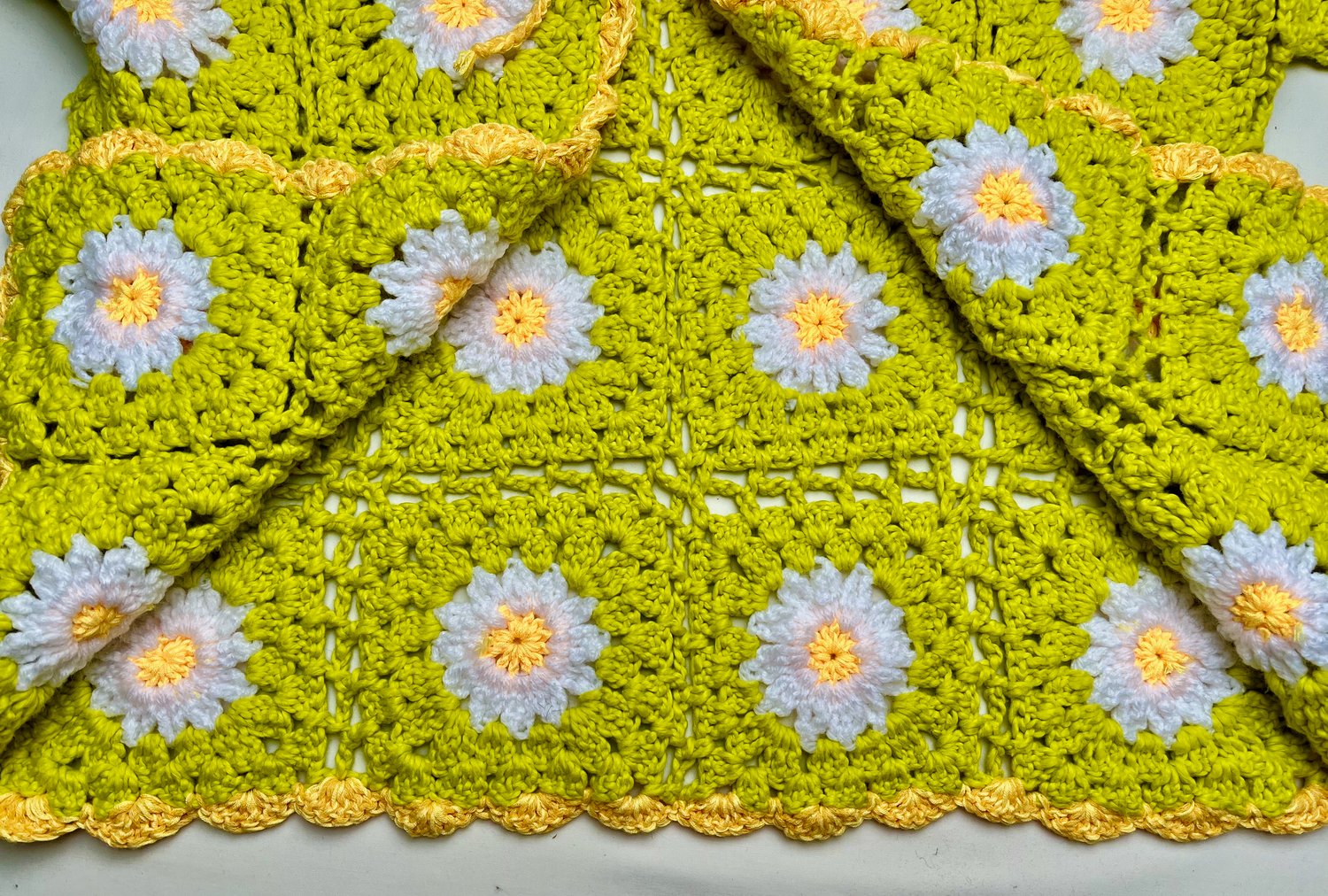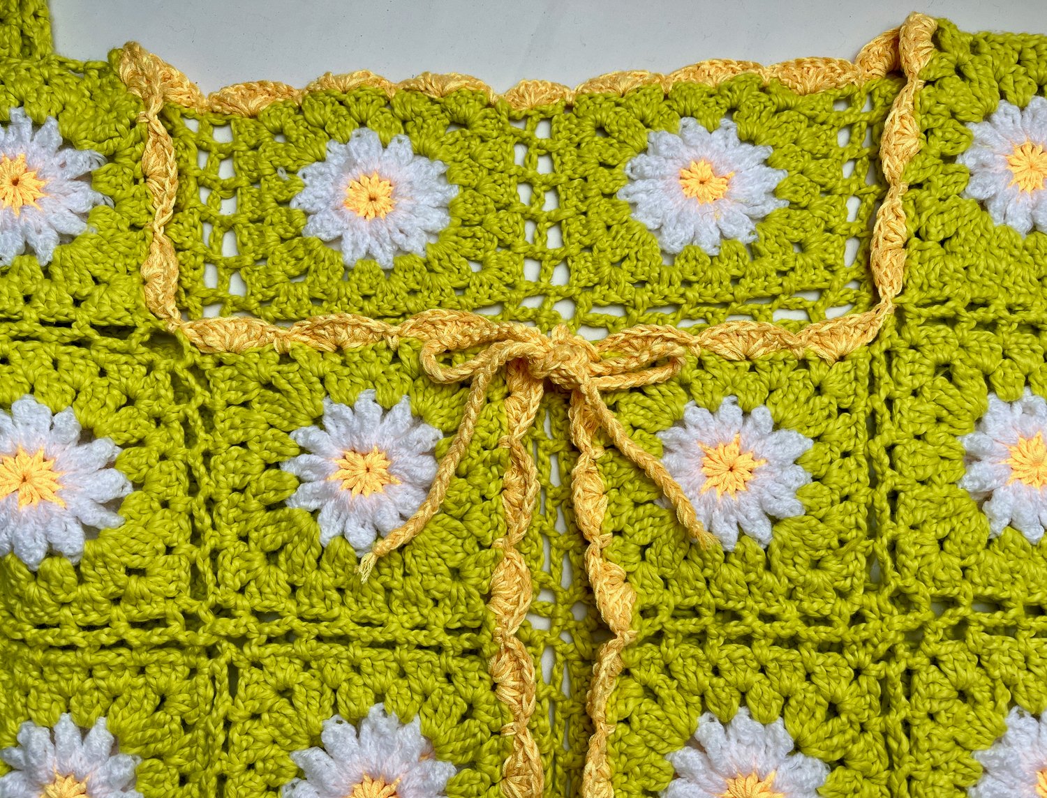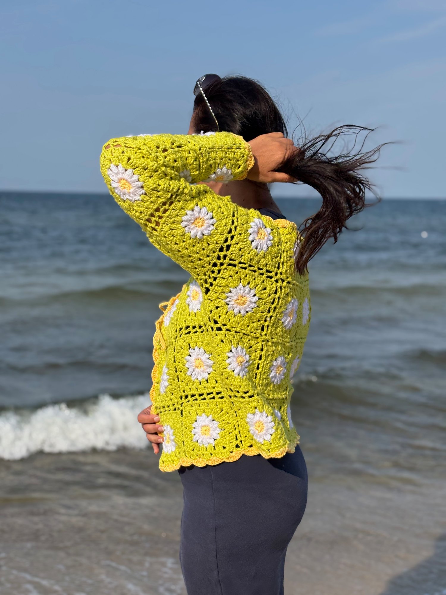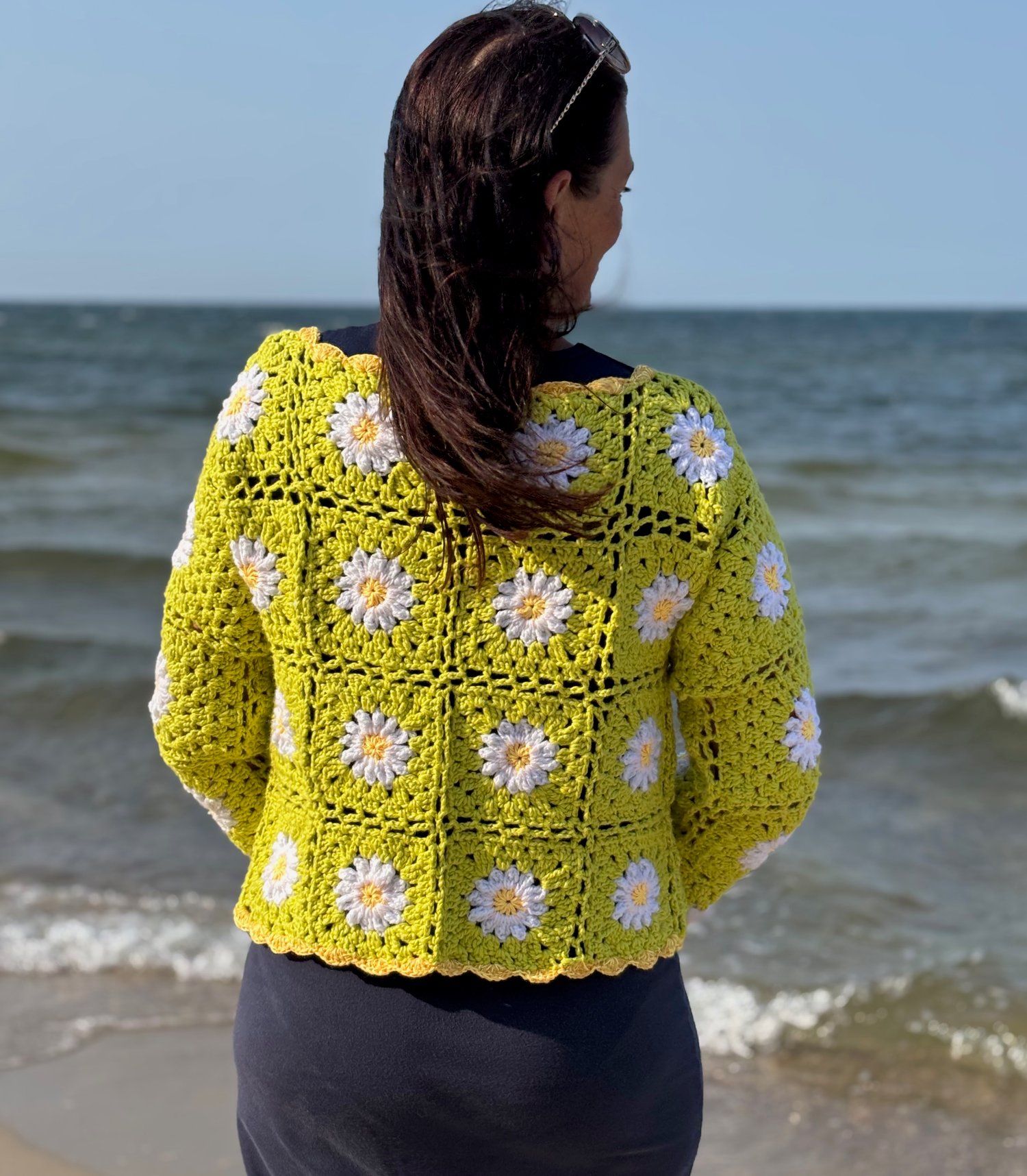 Svetr je háčkovaný z jednotlivých granny čtverců, což z něj dělá zábavný a originální projekt. Každý čtverec má uprostřed kopretinu se žlutým středem a bílými lístky. Lístky jsou uháčkovány s reliéfním vzorem, který jim dodává krásný 3D efekt.