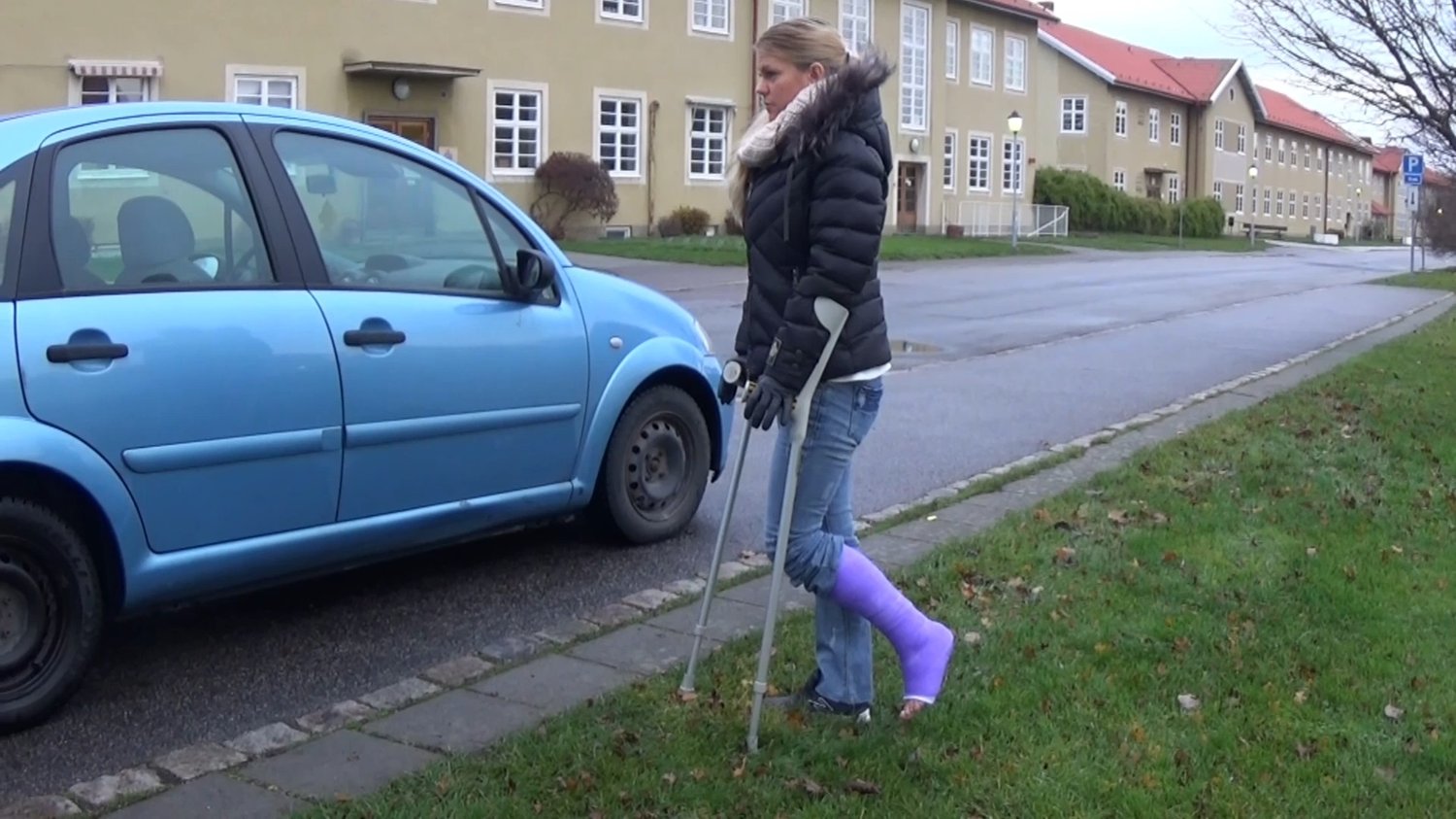 Ice is still wearing a SLC. But this time a purple one. She is crutching from her car heading for her old school. It is cold outside, so after a while she puts on a sock. She continues crutching inside the school yard before heading back to the car.