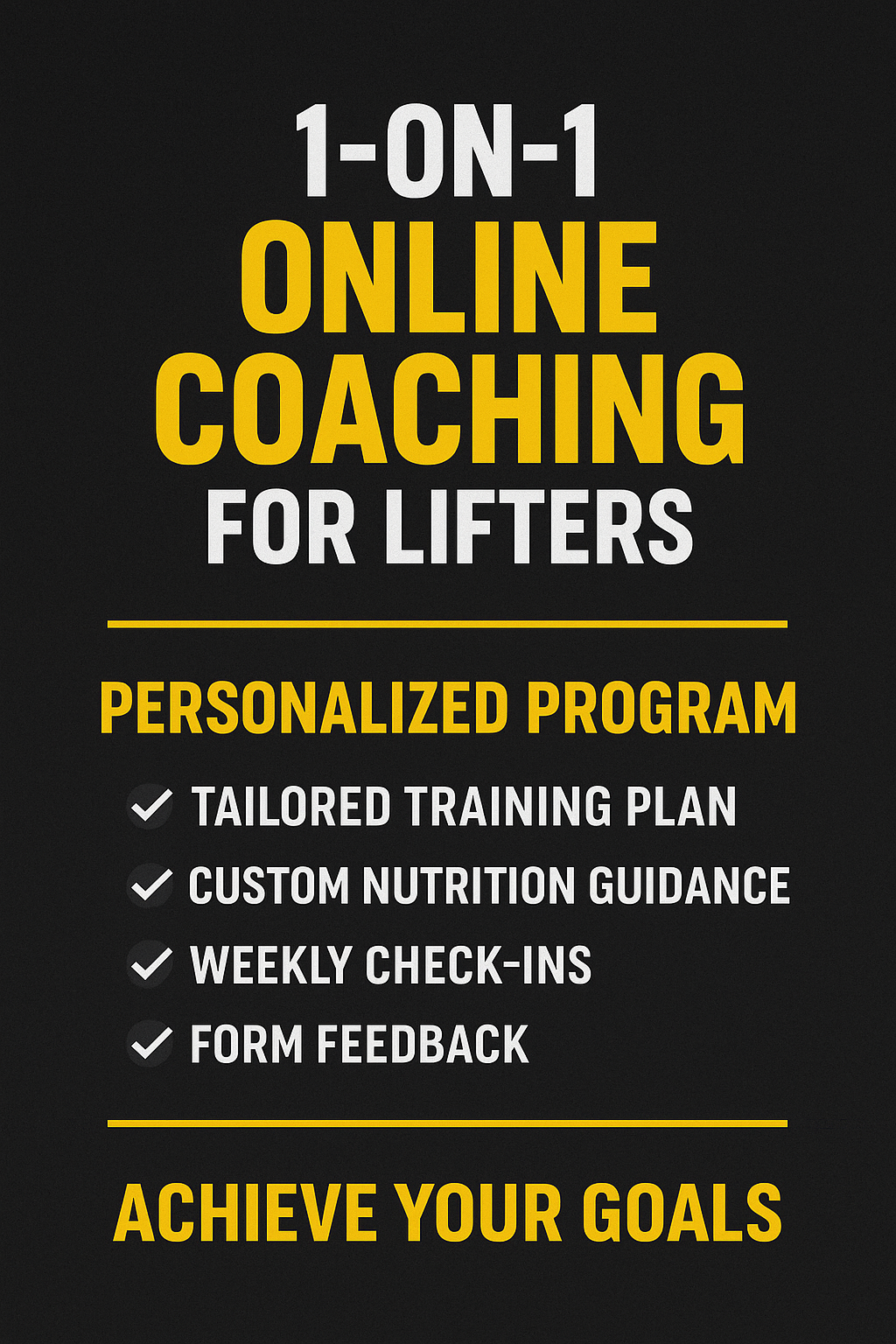 This coaching is for lifters of all levels who want a structured, personalized plan designed to maximize strength, muscle growth, and performance. Whether you're a beginner or a competitive lifter, the program is built specifically around your goals.