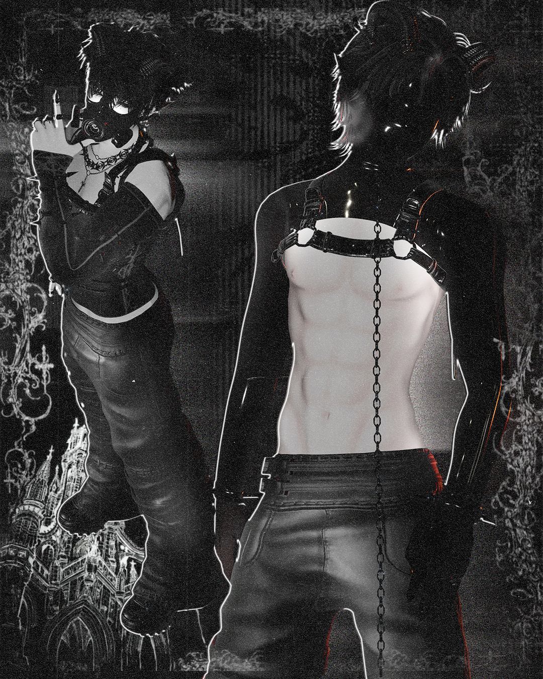 Assets made by me - Bracelets, Gas mask, Gimp suit, Latex suit, Waist harness, Leg garters, Socks, Choker&Chain, Arm Harness, Glasses, Piercings, Metal nose accessory, face metal accessory, earrings, Fox ears, Sweater, Rings, Horns, Body piercings, Tattoos, Necklaces, Gimp suit spike bracelets, eye texture.