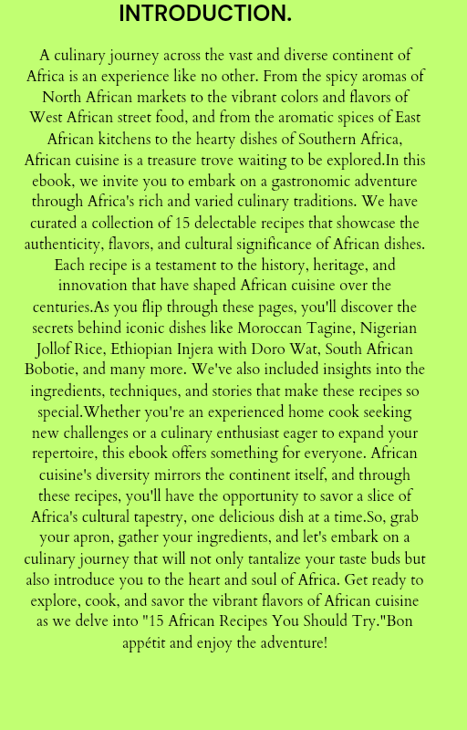 "Embark on a delectable adventure with our eBook featuring 15 authentic African recipes. From the savory stews of Ethiopia to the spicy jollof rice of West Africa, explore the vibrant flavors and rich culinary traditions of the diverse African continent. Discover the essence of Africa's culinary heritage and share the warmth, stories, and traditions through these delicious dishes."