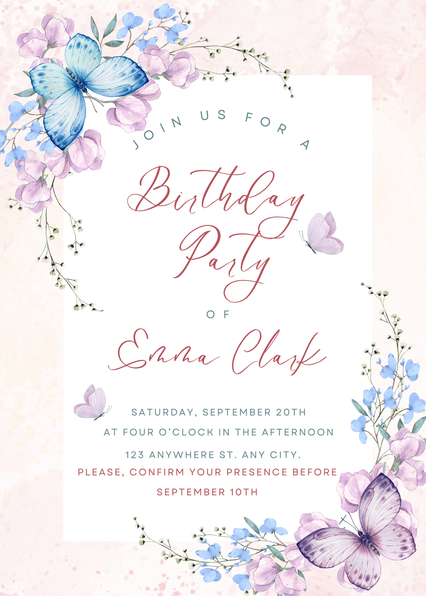 Join us for a heartfelt celebration! We've created a beautiful birthday invitation adorned with lovely watercolor butterflies and flowers. Feel free to personalize it with your details and share it with your cherished guests. We can’t wait to celebrate this special day with you!