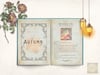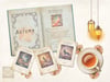 The gallery images above show the guidebook cover with fanned cards, a parchment flat-lay with roses and lanterns, a peek inside the autumn pages, and a peaceful lifestyle scene with a teacup and candlelight.