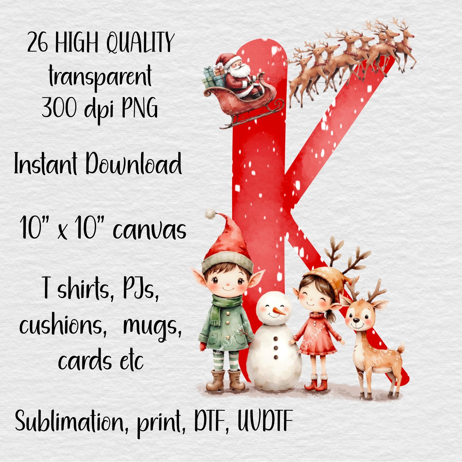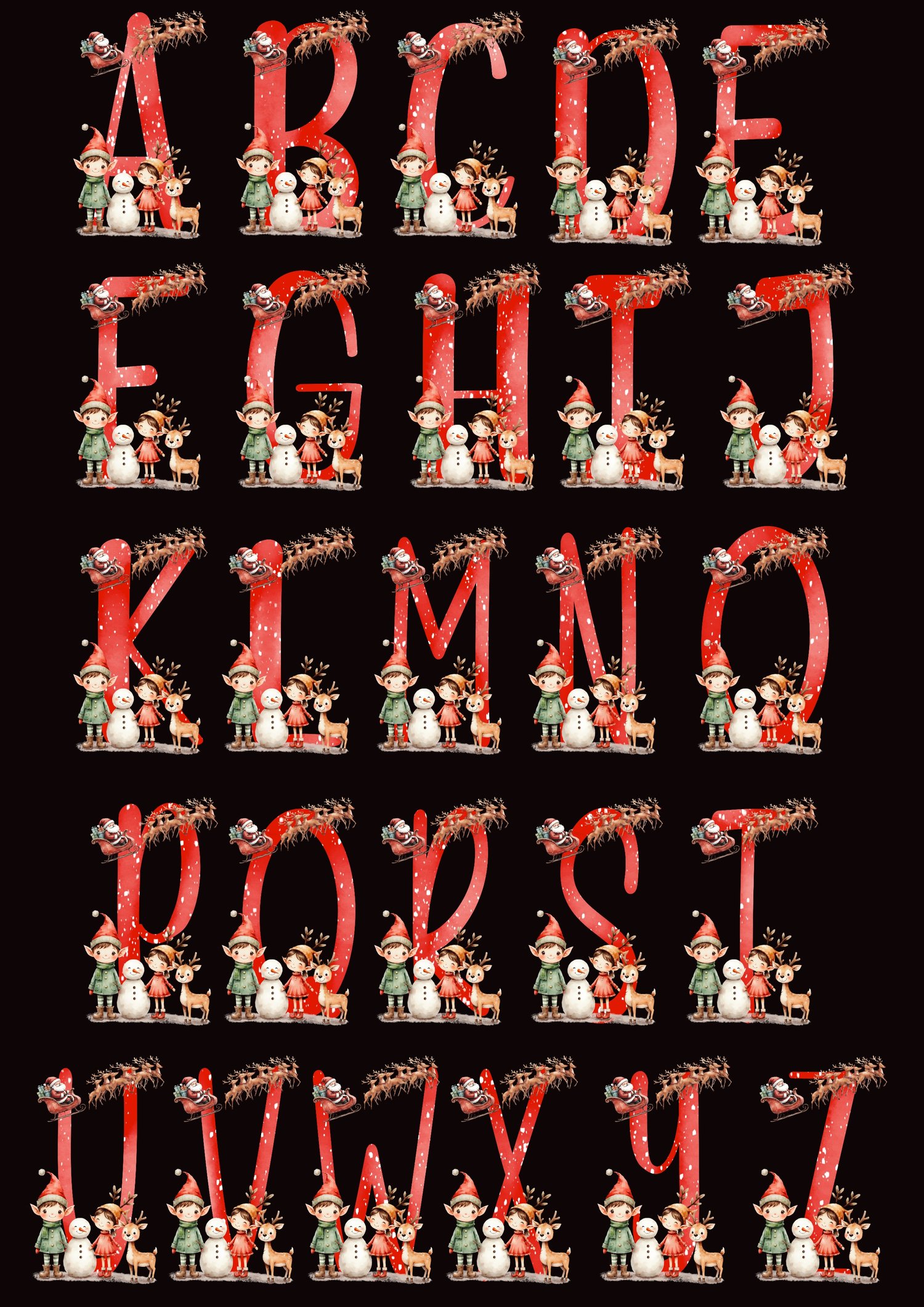 Santa and Elves Christmas alphabet. A-Z including Santas elves plus reindeer and snowman friends. 26 letters with watercolour and snow detail. 26 PNGs. 300 DPI, instant download. Sublimation, print, DTF, UVDTF, Instant download