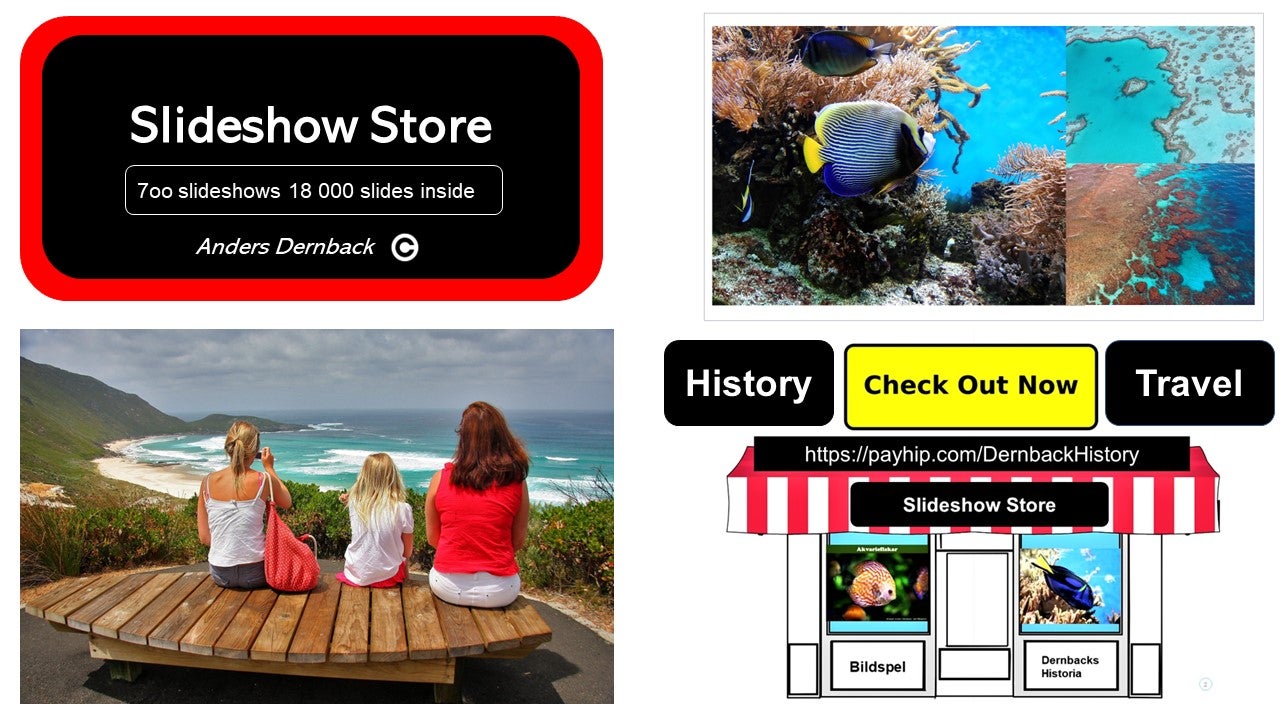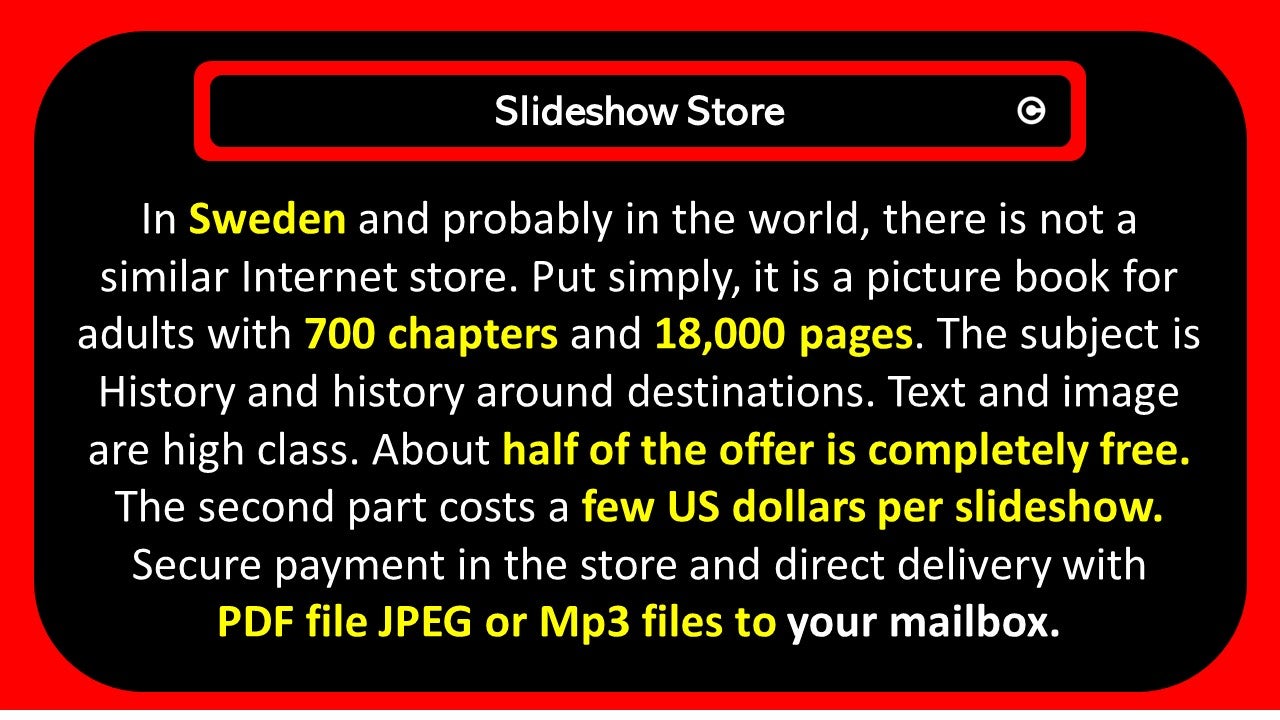 In Sweden and probably in the world, there is not a similar Internet store. Put simply, it is a picture book for adults with 700 chapters and 18,000 pages. The subject is History and history around destinations. Text and image are high class. About half of the offer is completely free. The second part costs a few US dollars per slideshow. Secure payment in the store and direct delivery with PDF file JPEG or Mp3 files to your mailbox. Download to look at some examples (first pages).
