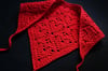 This is an intermediate Tunisian crochet lace pattern for a triangle-shaped bandana with ties. It is built from the tip at the bottom and it grows with each row.