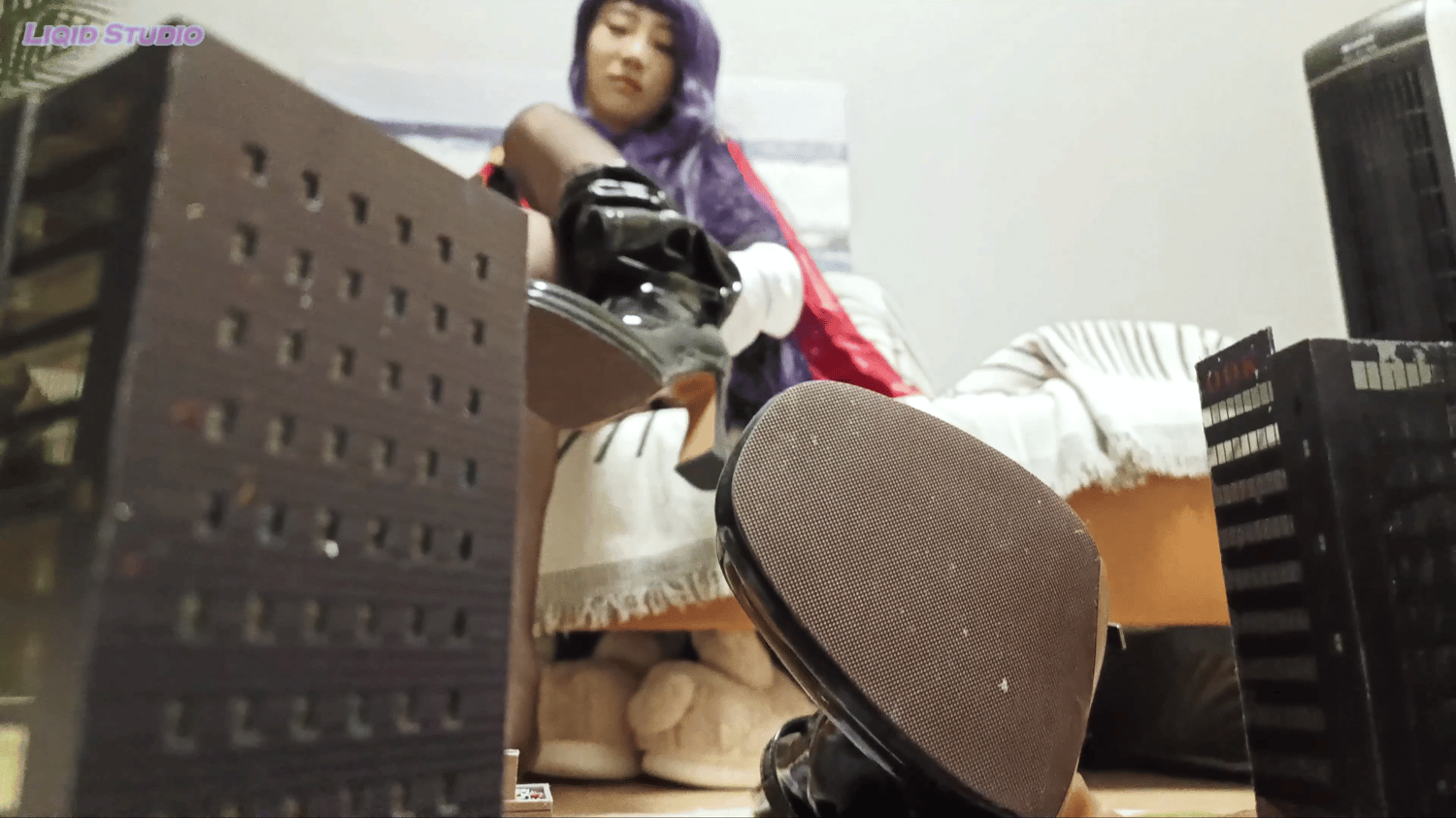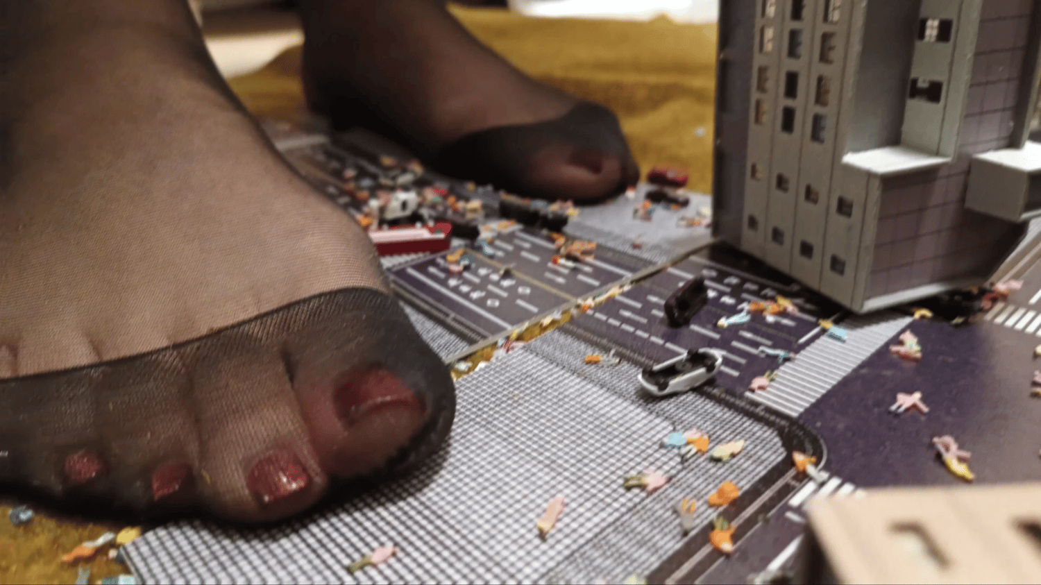 Dropping her boots, crushing structures in her grip, and sucking "bite-sized" escapees into her mouth, she toys with crawling "vermin" in cars and buses, making them dance in her palm.