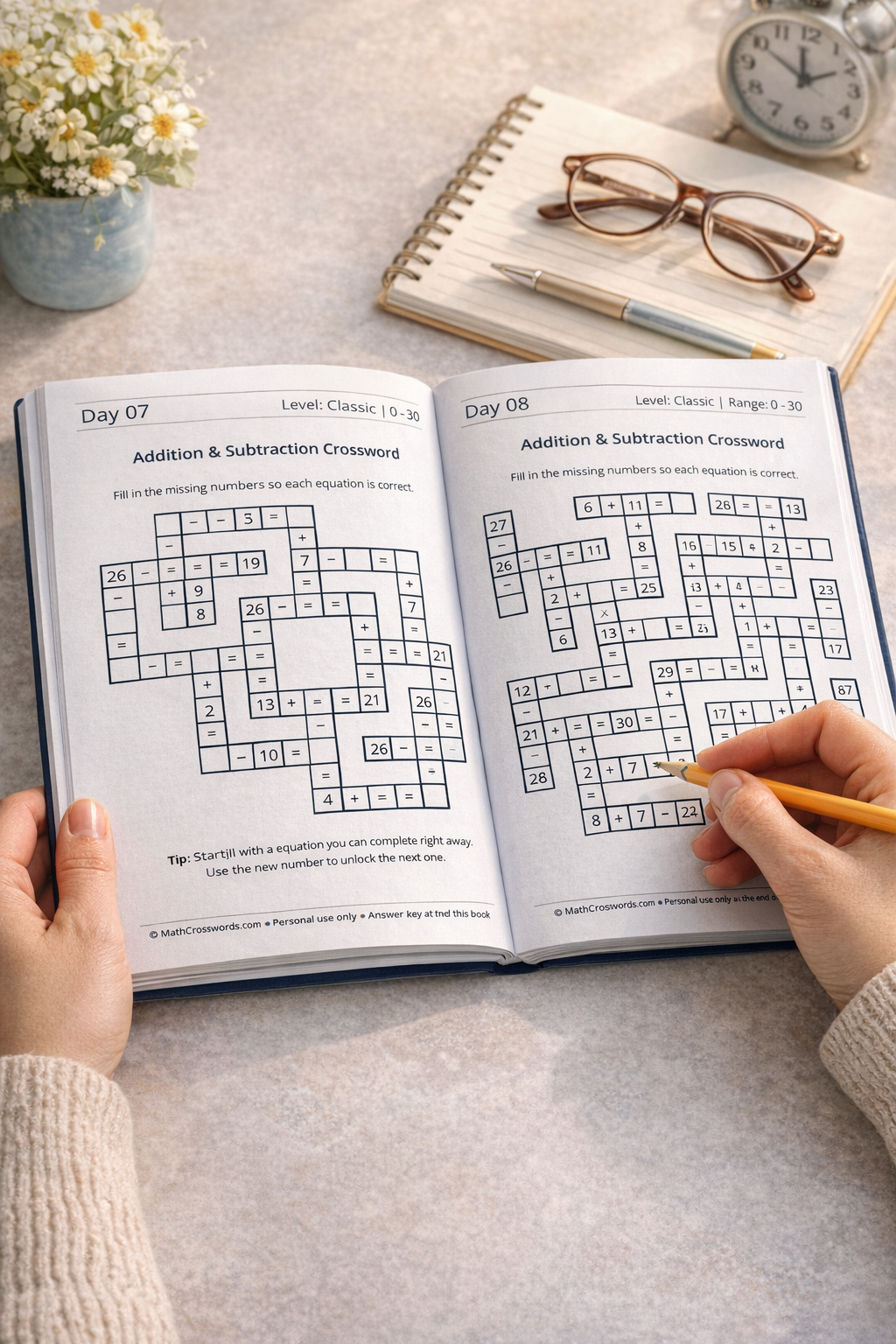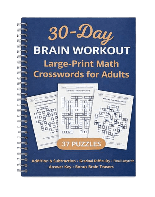 30 interconnected math crosswords, designed as a 30-day brain workout you can enjoy at your own pace.