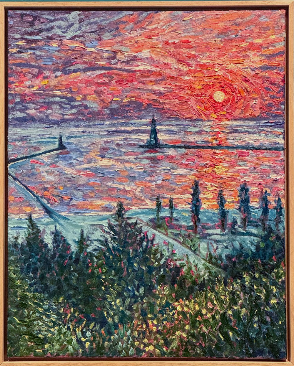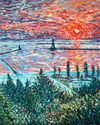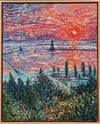 A contemporary imppressionism take based on a photo I took on a hike in Michigan. Canadian wildfires contributed to the striking sunset. This oil painting has vivid colors, thick impasto strokes that aren't overly layered and a bright underpainting. The paint strokes are intended to play off of one another and not just blend together. I think that's why people respond to Impressionism. It's been challenging in a good way to work in this style, which also requires more planning and paint mixing up front.