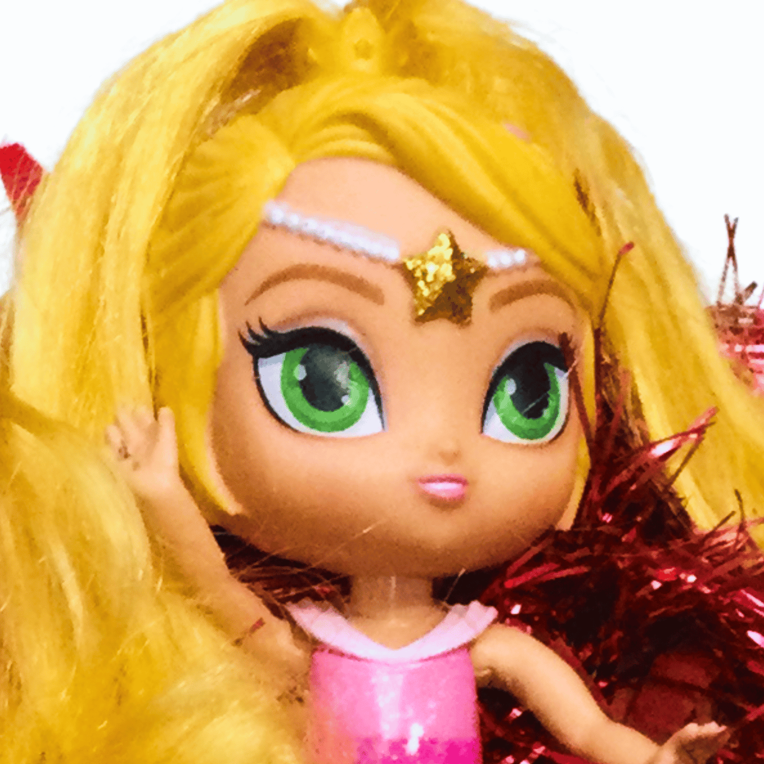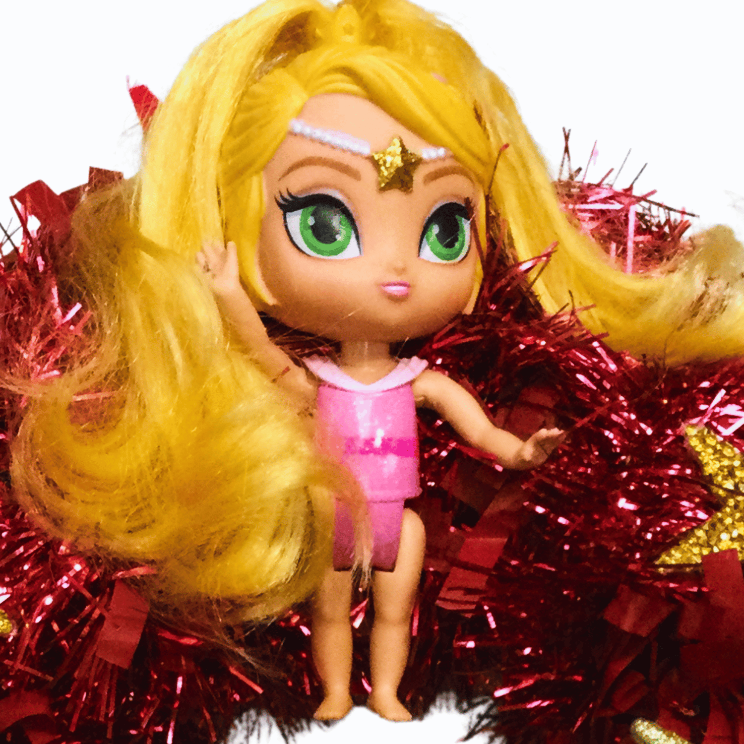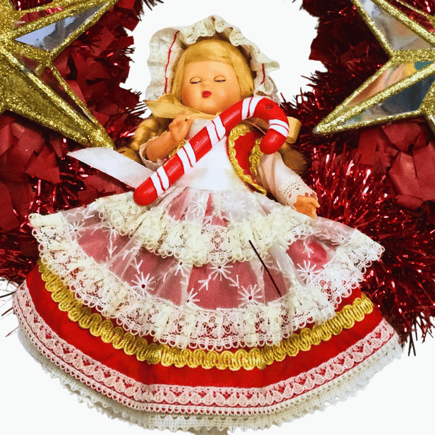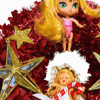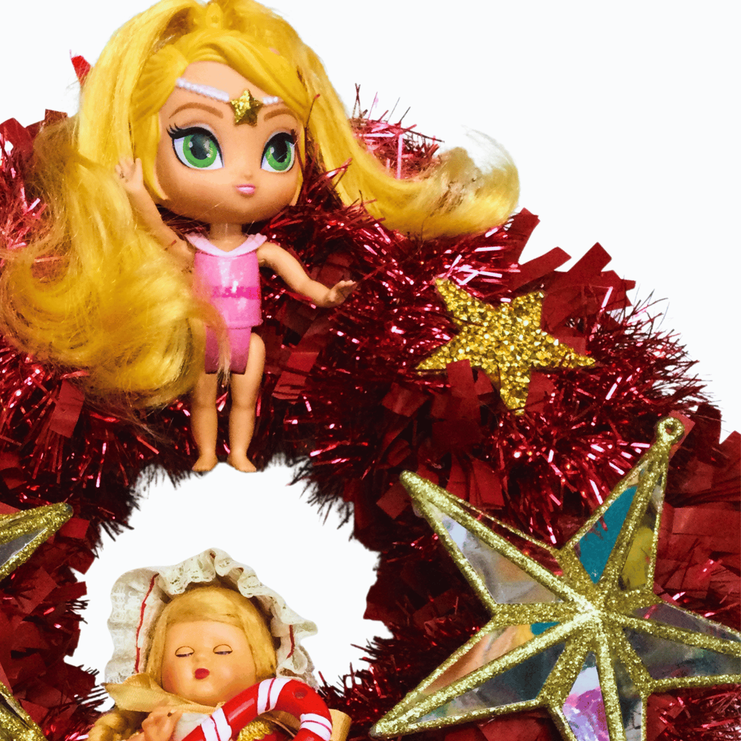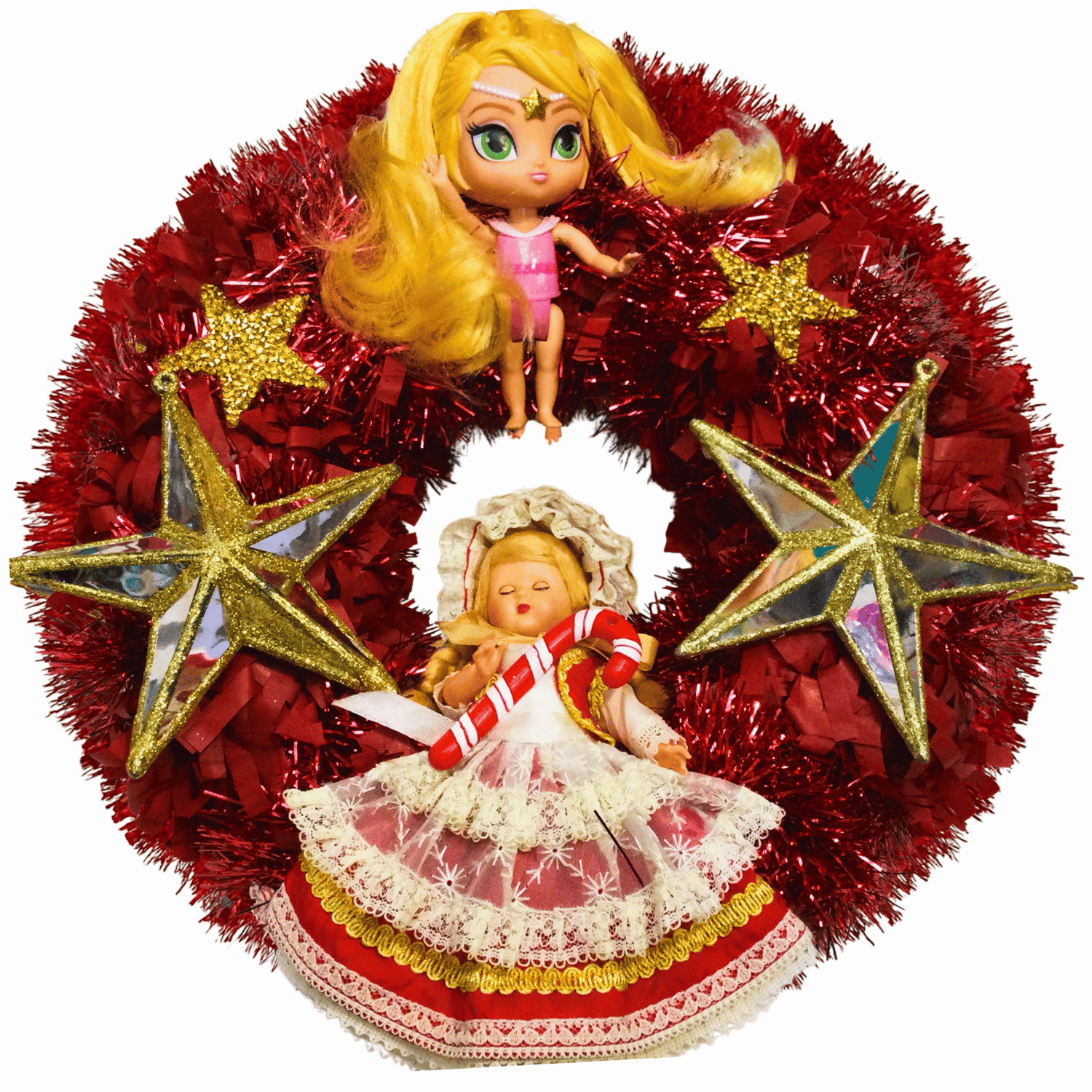 Check out these super dolls from both the 1950s and the 2020s. Big, glittering, golden, and mirrored stars surround them on this sparkly, one-of-a-kind wreath. It's the ideal supernova statement piece for a room and a great party wall feature too.