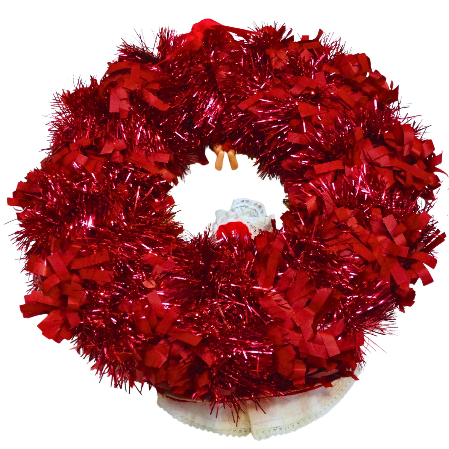Made from carefully checked, cleaned, and upcycled plastic and vintage dolls; glitter stars; vintage and modern papers; tinsel and other blingalicious beauties, this colourful, upbeat wreath is large, measuring 30 cm in diameter. Ideal for adding some extra light and loveliness to your home.