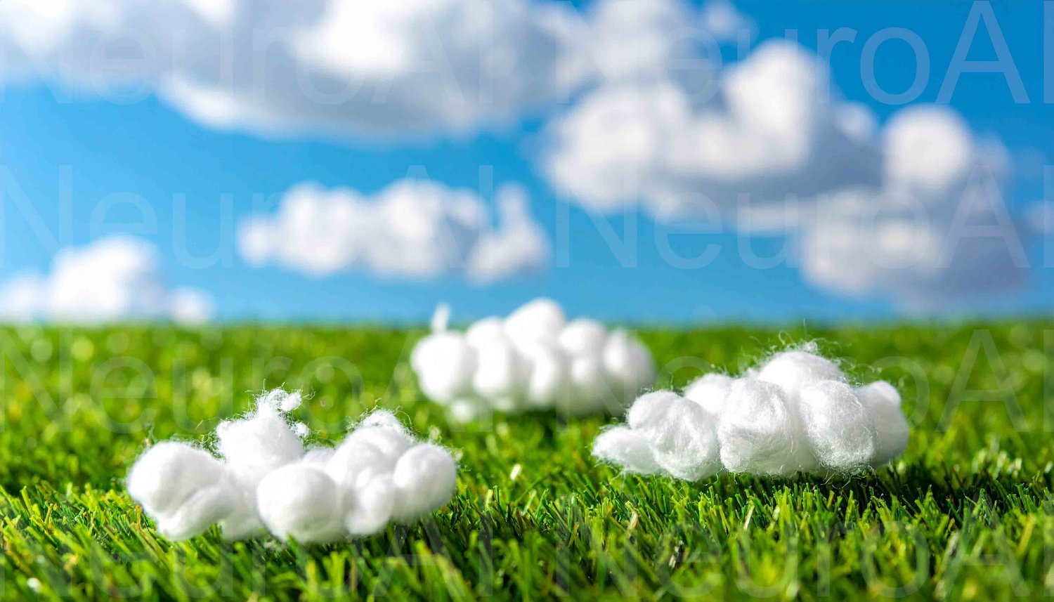 Fluffy cotton clouds sit on lush green grass
