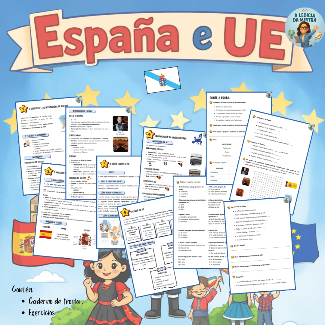 Material para repasar e aprender de xeito práctico todo sobre España e a Unión Europea adaptado ao temario de 6º EP.