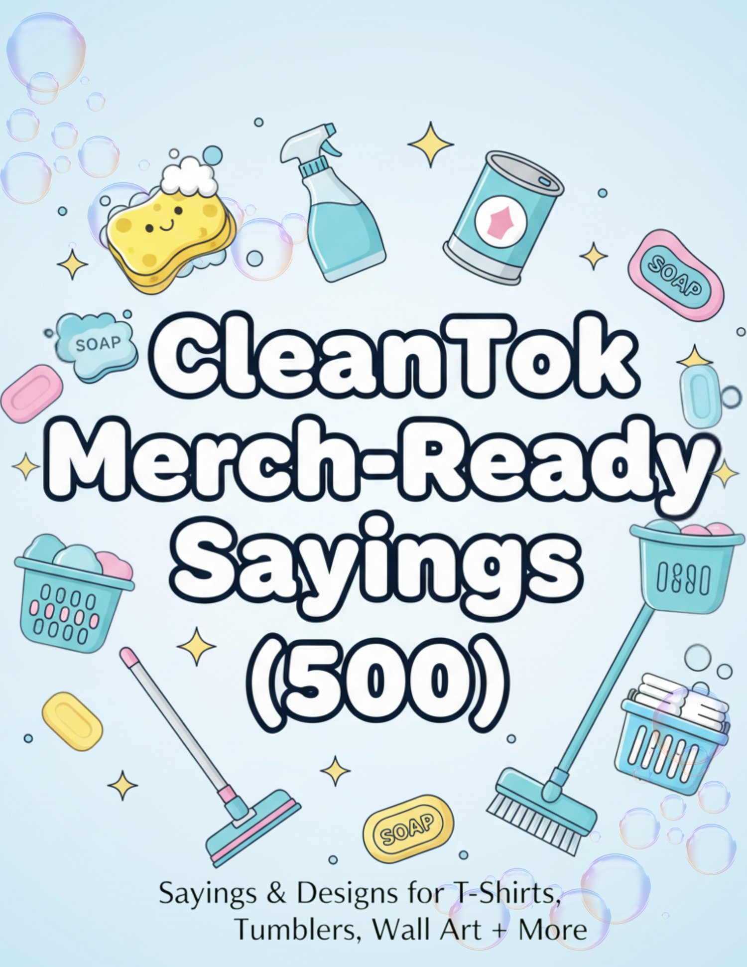 500 CleanTok Merch Prompts | Digital Prompt Bank for T-Shirts, Tumblers, Stickers & Wall Art | Cleaning, ASMR, Bubbles, Soap & Laundry Lovers
