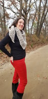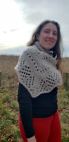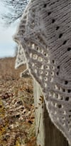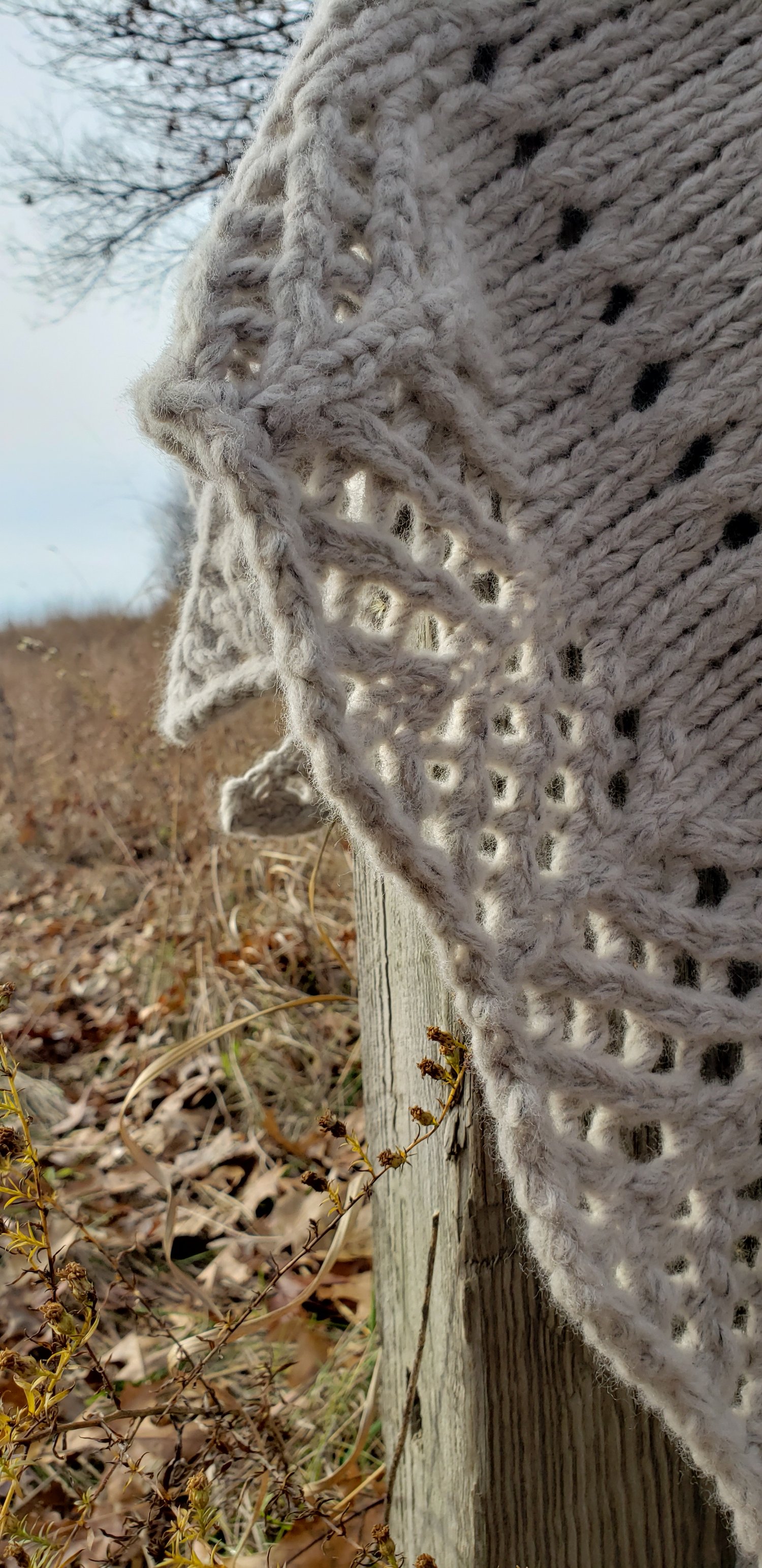 Declination is a cozy, relaxing top down triangular shawl. Mostly stockinette with a few simple eyelet rows, and finished with a cute lace border. Made with bulky yarn, it knits up super quickly, and is snuggly and warm for the darker days of winter.
