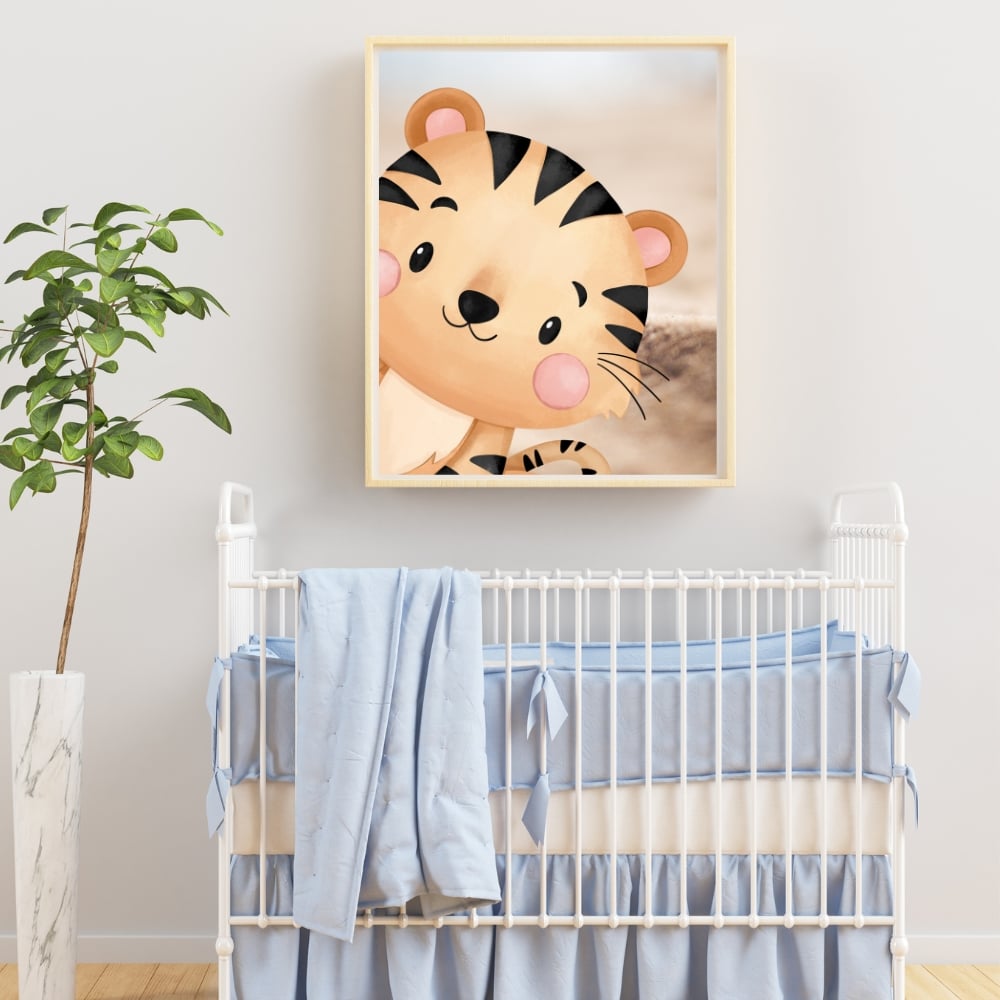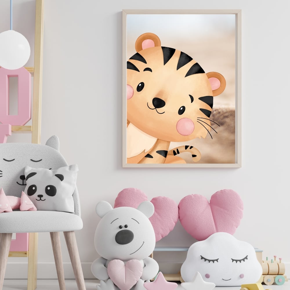 Agrega un toque de suave ternura al espacio de tu pequeñ@ con esta adorable lámina decorativa de un tigre bebé para la habitación infantil.