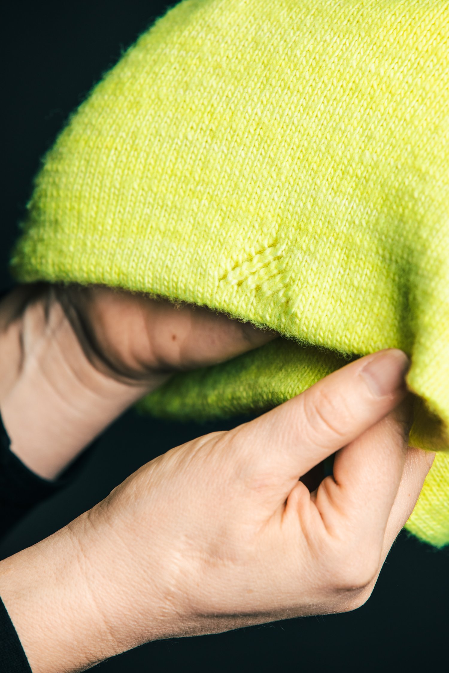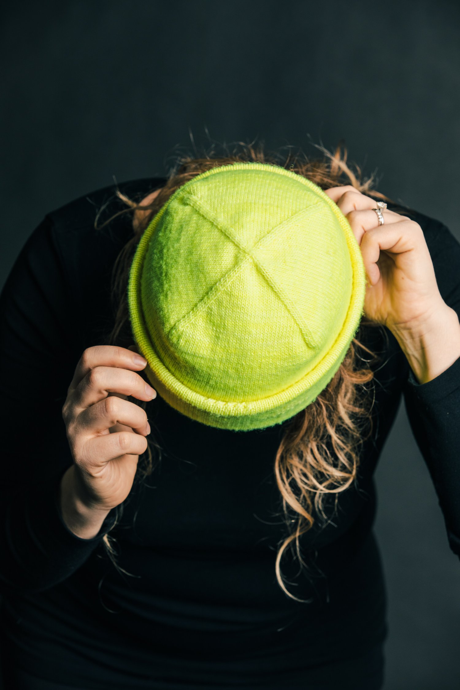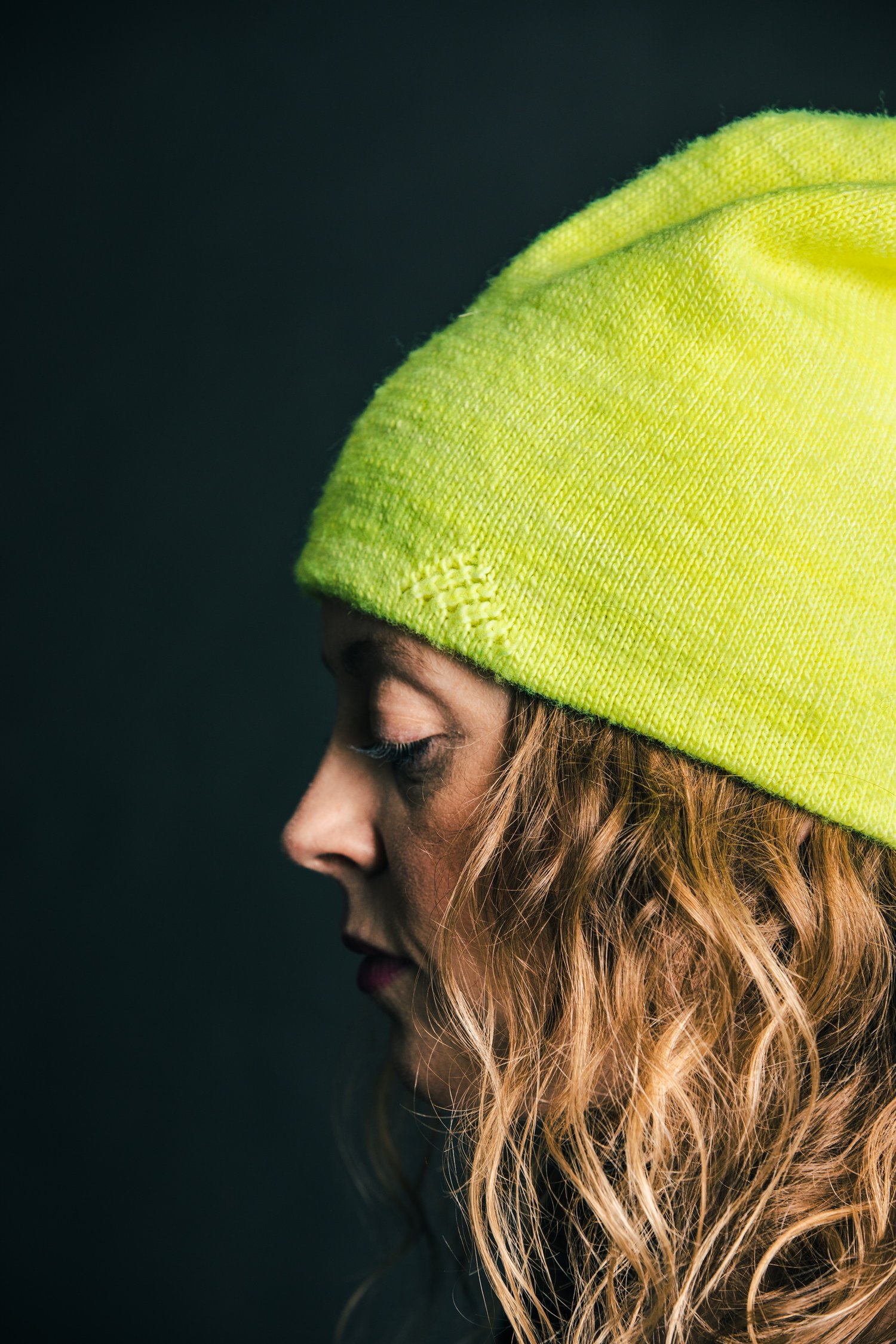 The high bean hat was designed because I wanted a quality knit, double walled beanie, that could be worn sitting high or slouching. It can also be worn with the brim folded for a more traditional look, and with or without the lace triangle showing. The triangle is the strongest shape in the universe. In terms of recovery it is a symbol of strength, experience and hope.