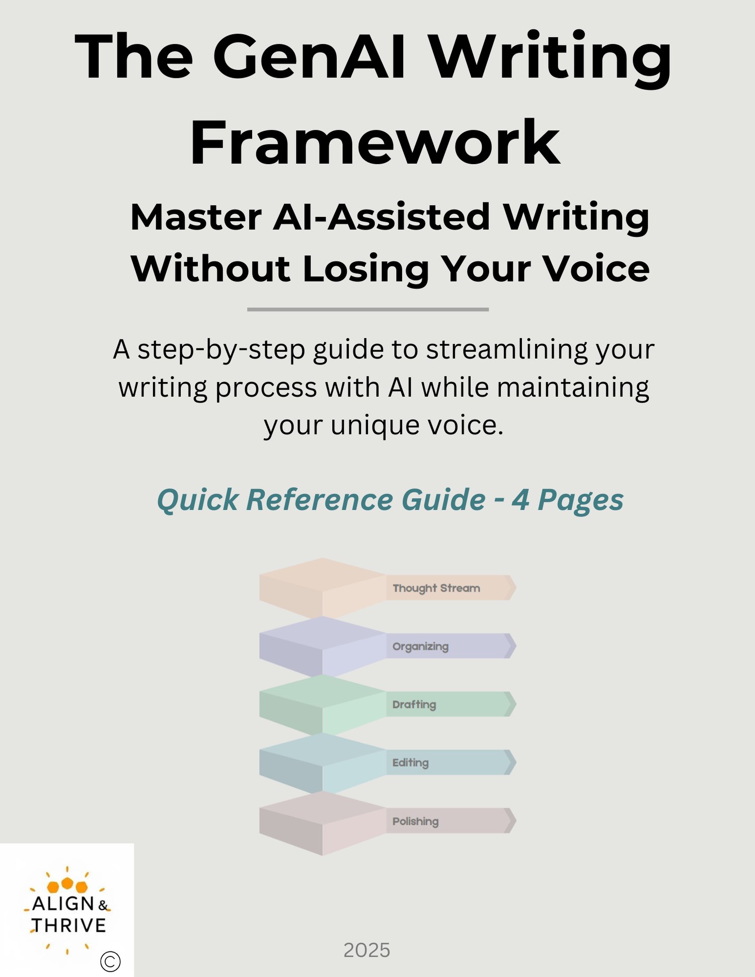 Unlock the power of AI without sacrificing your unique voice! The GenAI Writing Framework is a concise, 4-page guide designed to help you leverage AI tools like ChatGPT as a writing assistant—not a replacement. Whether you’re a blogger, author, or content creator, this framework simplifies the writing process by breaking it down into clear, actionable steps without overwhelming technical details.