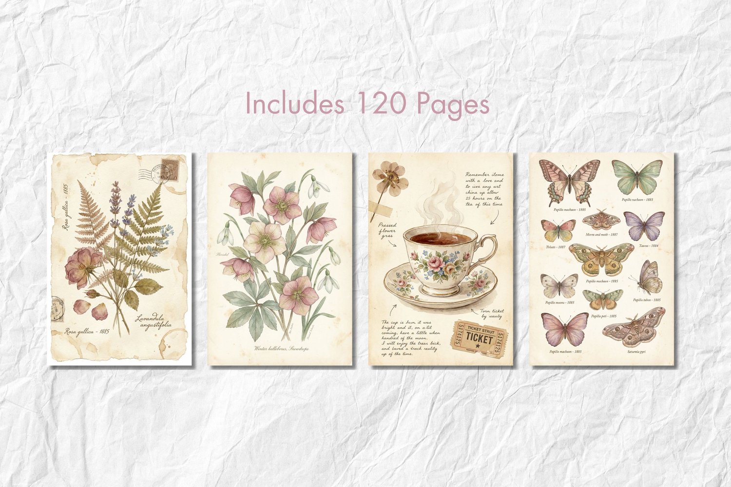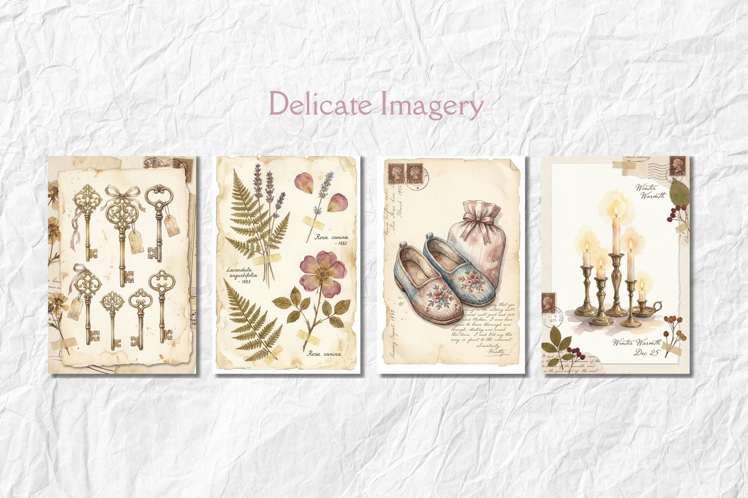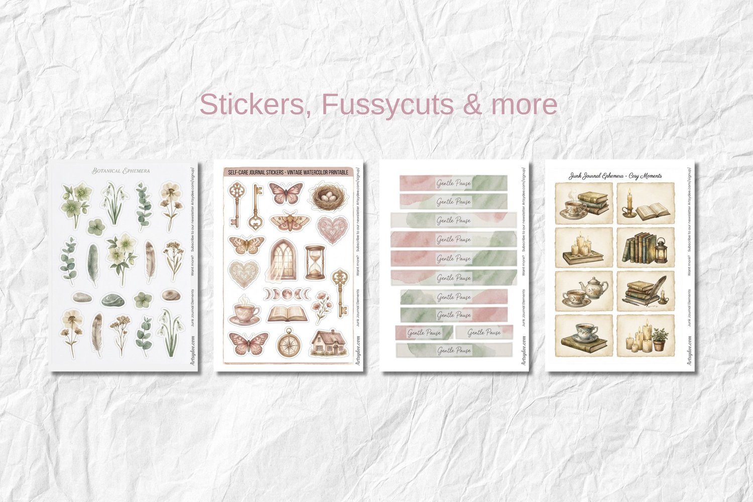 ⋒ Cut-out ephemera sheets—cosy teacups, candles, stacked books, botanicals, moons, vintage keys and more