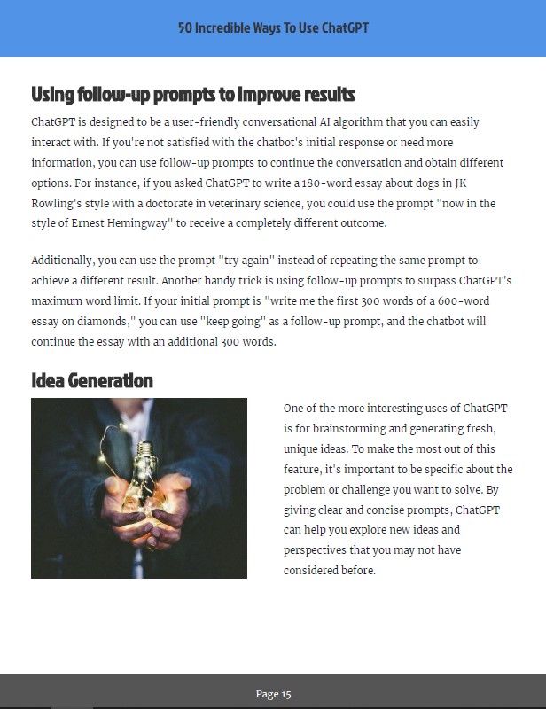 This e-book offers plenty of ChatGPT tips and tricks for generating exceptional outputs that can be used for any type of content. Take advantage of the incredible power of ChatGPT now.